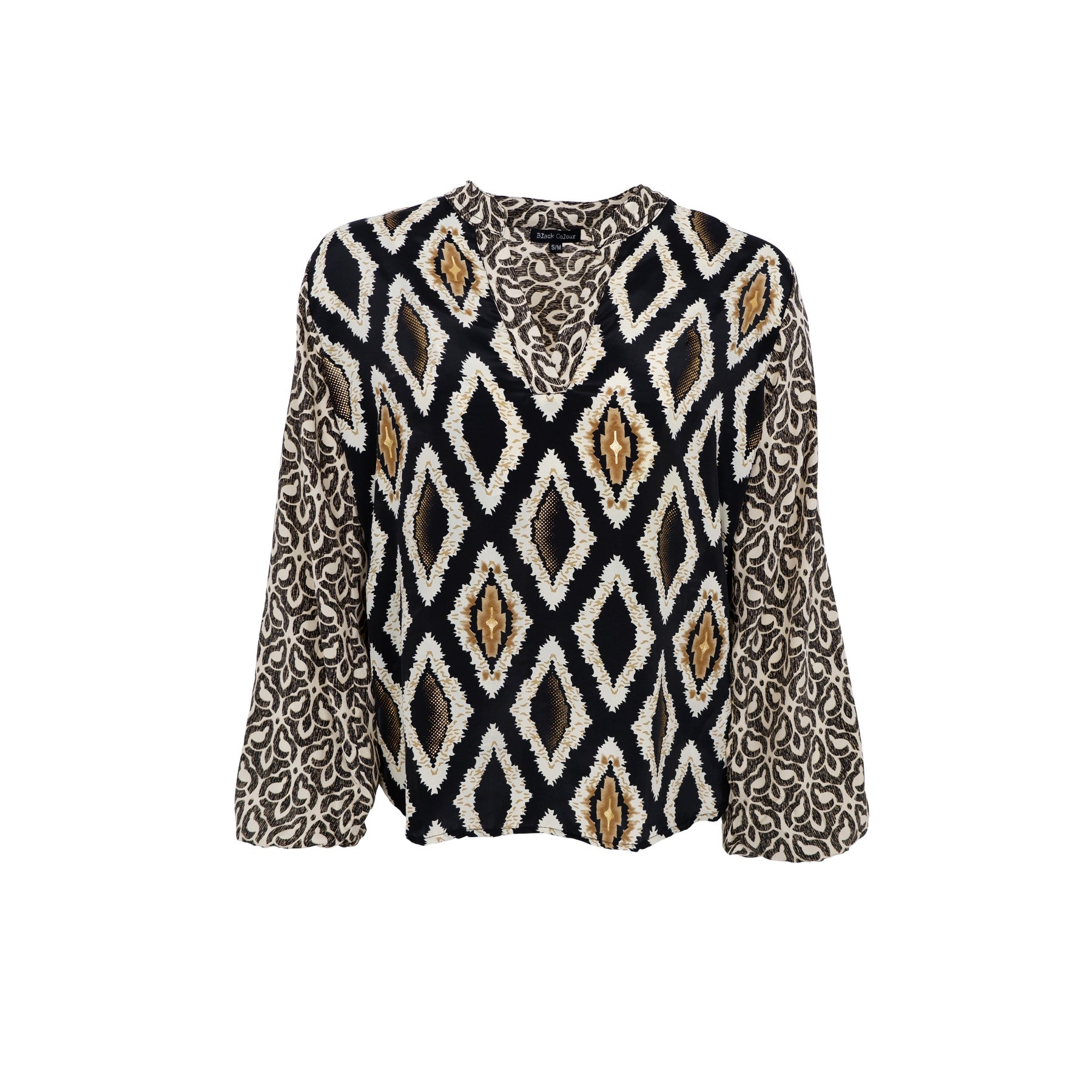 Den smukke Luna bluse i sort, råhvid og guld.