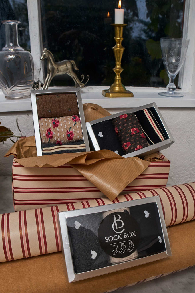 Lille sød og fin Love box med 3 forskellige par bløde og fine sokker. De har det sødeste hjertedesign på dem og kommer i farven beige, grå og sort.