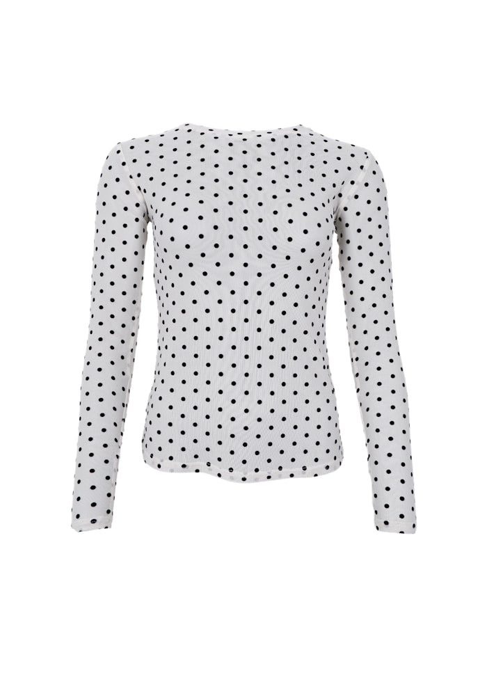 Helt enkel mesh bluse fra Black Colour i en skøn off white farve med søde små sorte prikker. Blusen har rund hals og lange ærmer, og er desuden gennemsigtig.