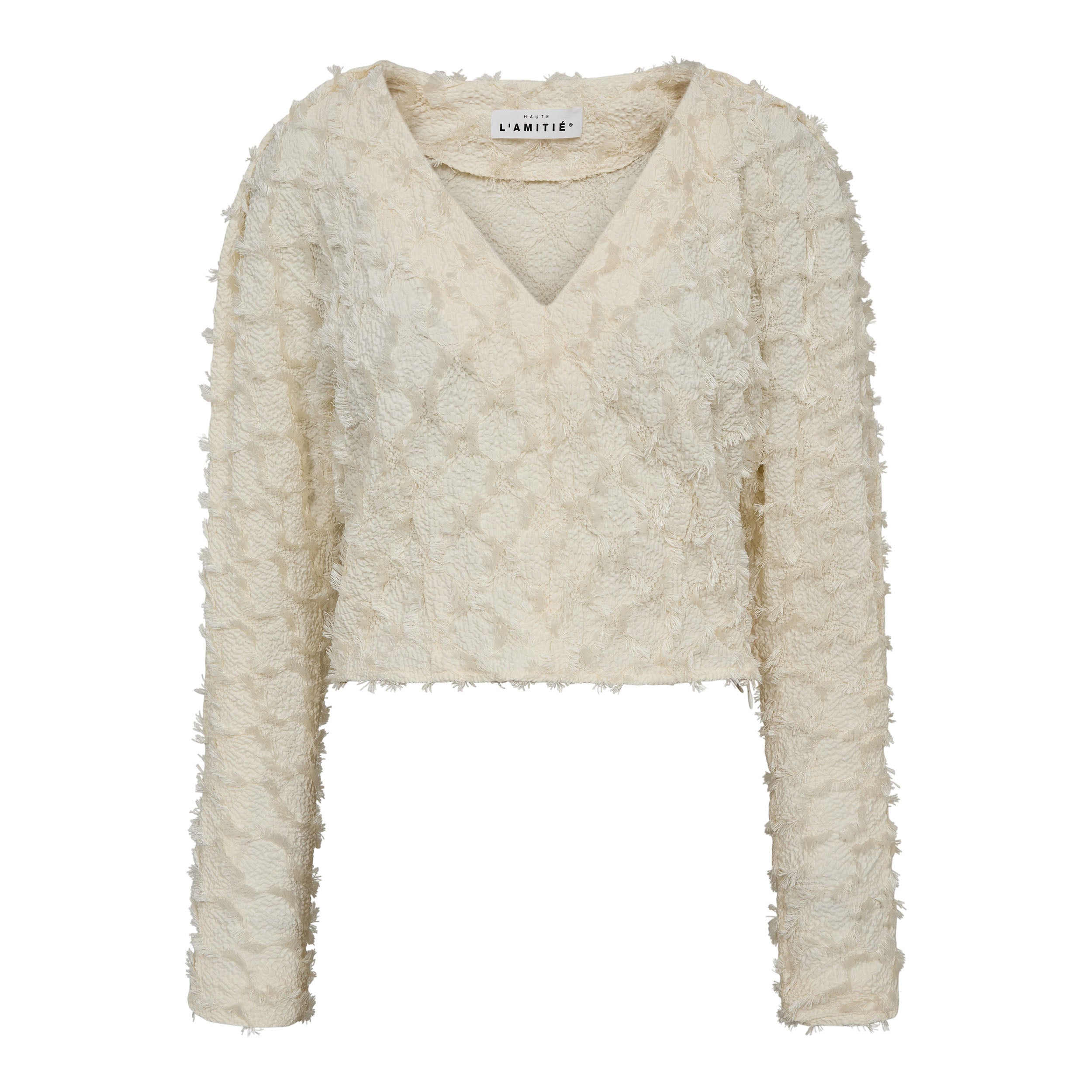 Flatternede bluse fra Haute L'amitie i en skøn off-white farve. Blusen har v-udskæring, længe ærmer og er fyldt med frynser.