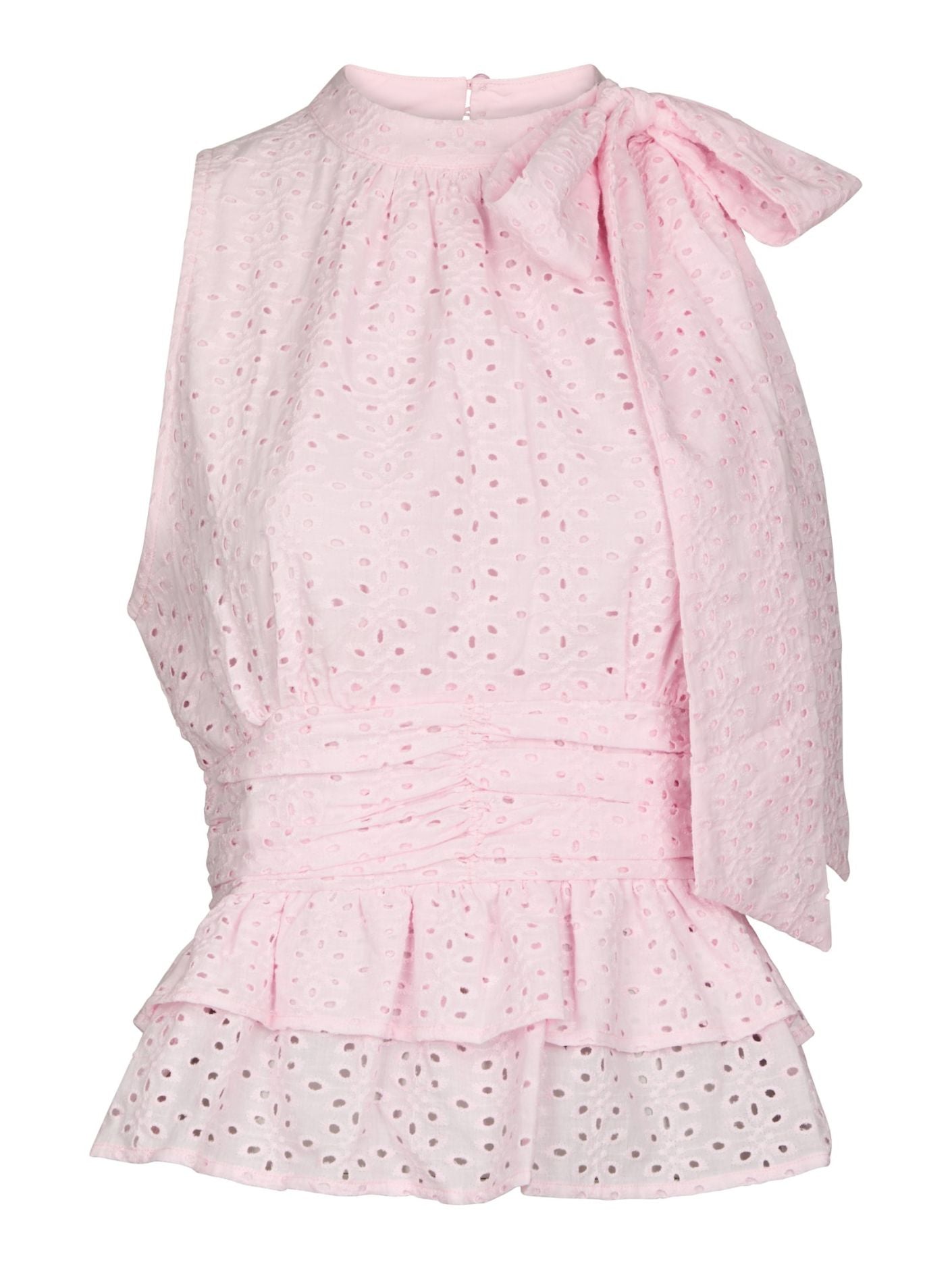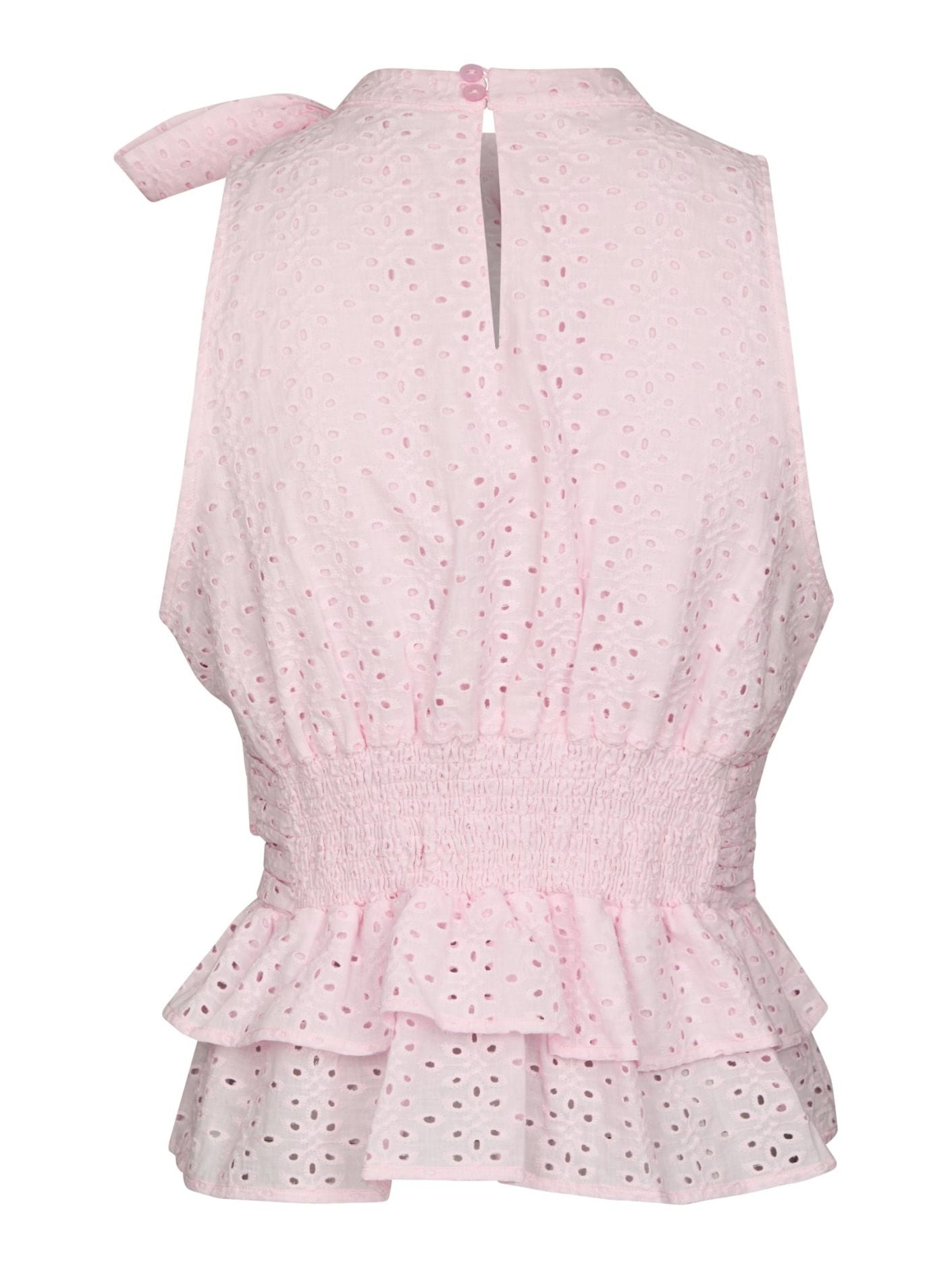 Denne top fra Neo Noir er en feminin og elegant ærmeløs bomuldstop med fine broderidetaljer og dekorative designtræk. Toppen har en tætsiddende pasform med en høj halsudskæring, der skaber et klassisk og sart look, perfekt til både hverdag og fest. Den er lavet i 100% bomuld med broderie anglaise-detaljer, som giver et romantisk og let udtryk. Den har en stor sløjfe ved halsen og flæser ved taljen, som tilføjer karakter og charme til designet. Derudover lukkes den med en kombination af elastik, knapper og snøre på ryggen, så den er let at tage af og på.