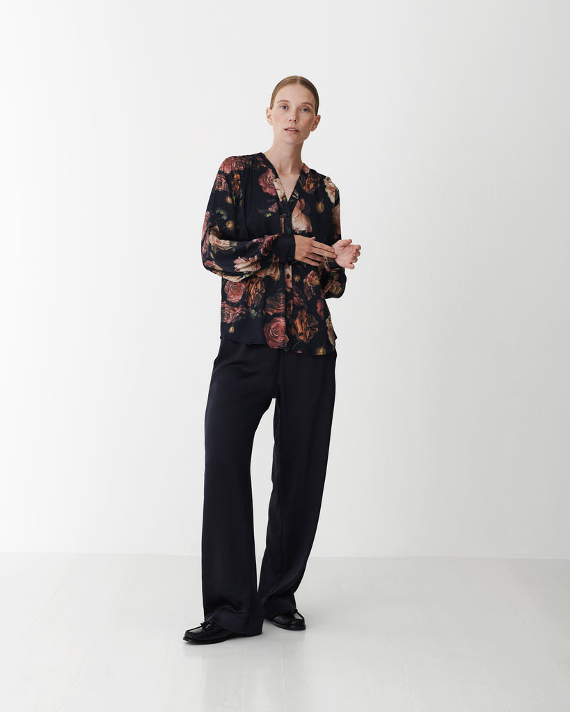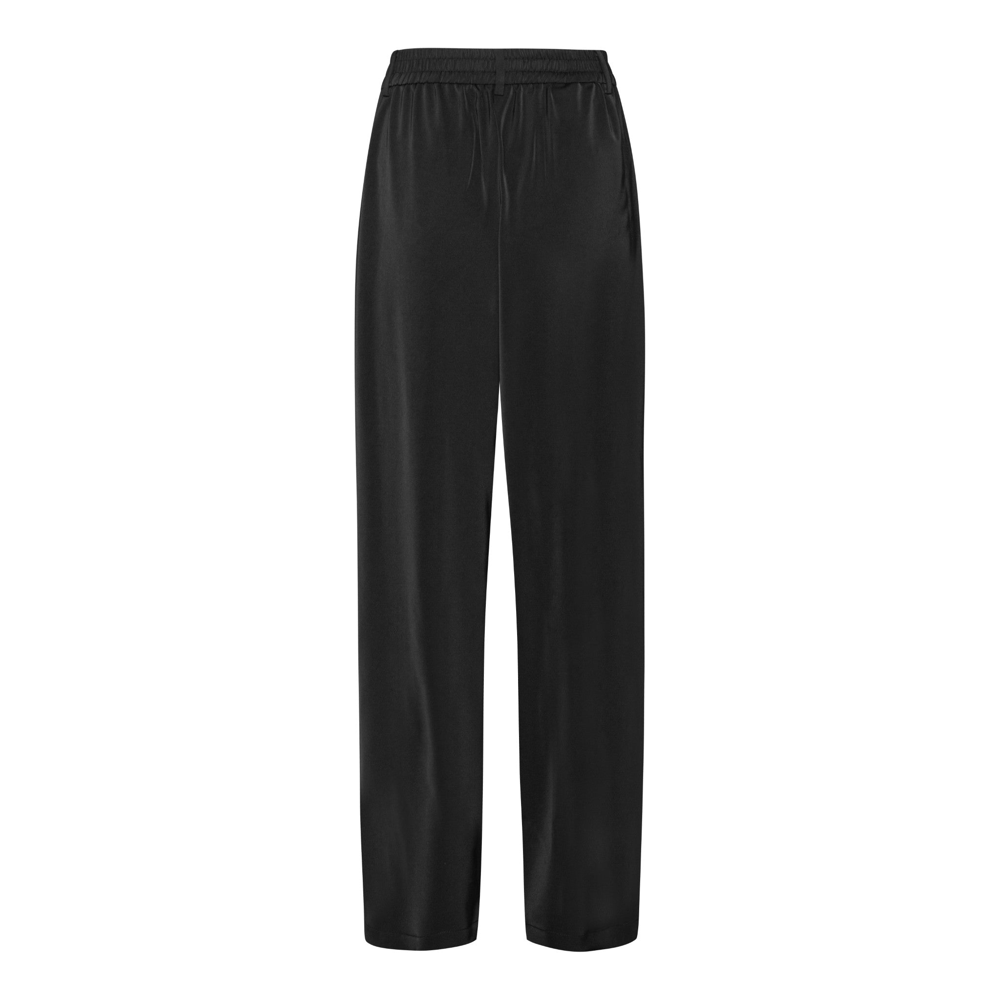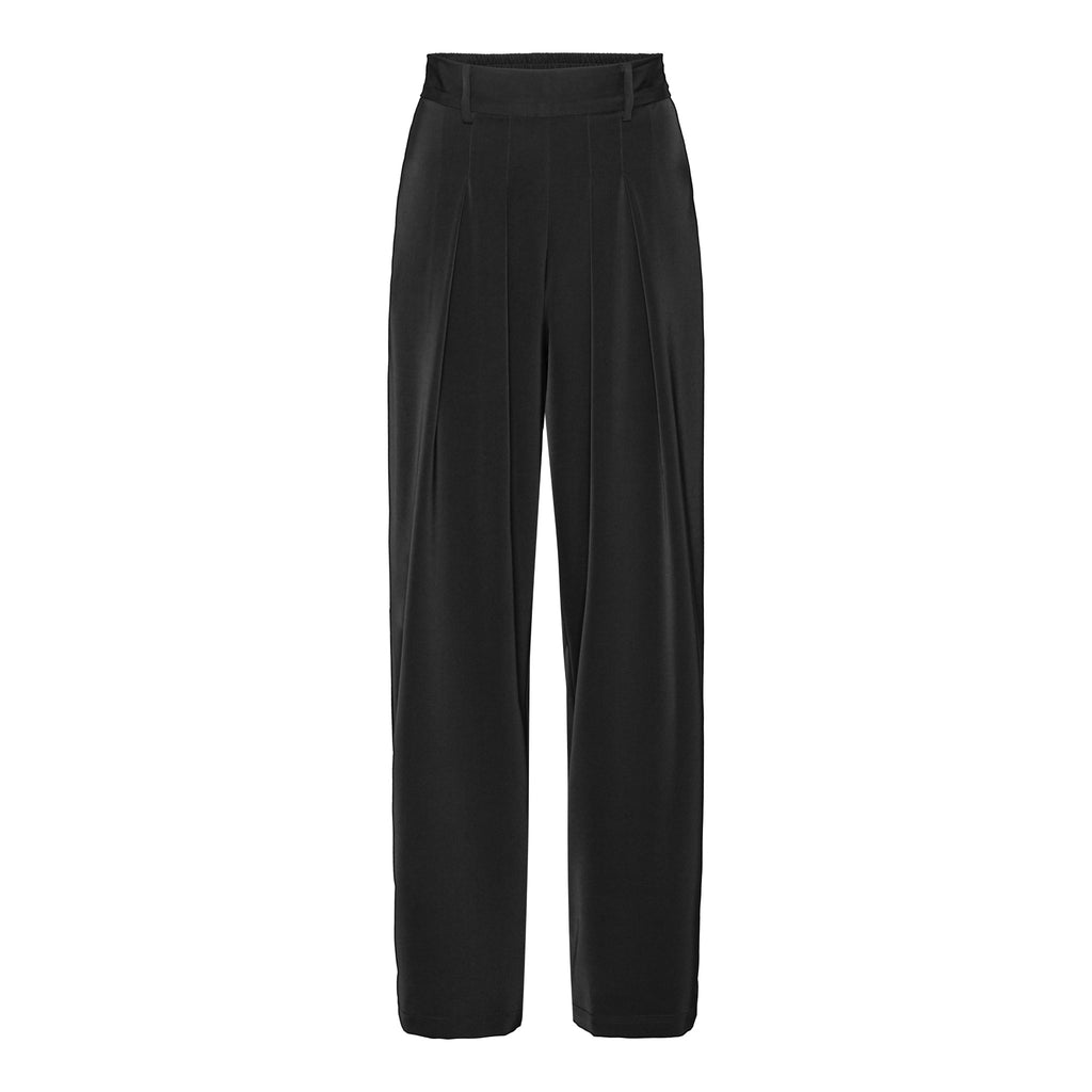 Den lækreste bukse-nyhed fra Karmamia. Buksen er højtaljet, med vidde ben og de fineste læg ned foran. Desuden har den både bæltestropper og elastik bagtil.