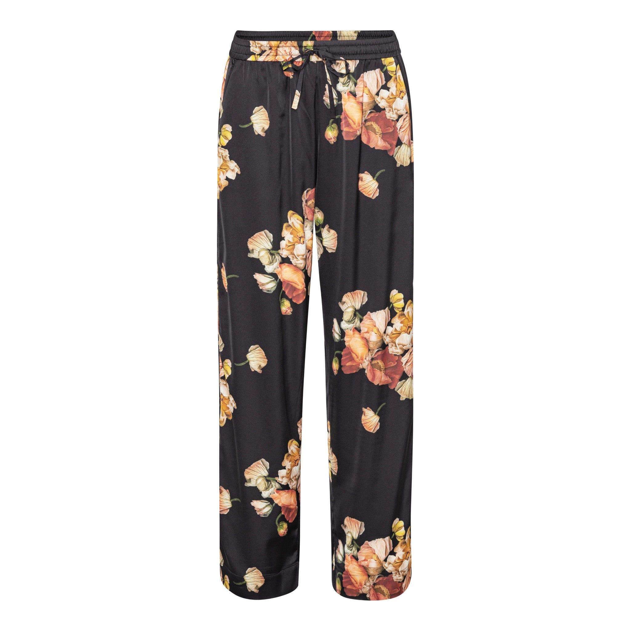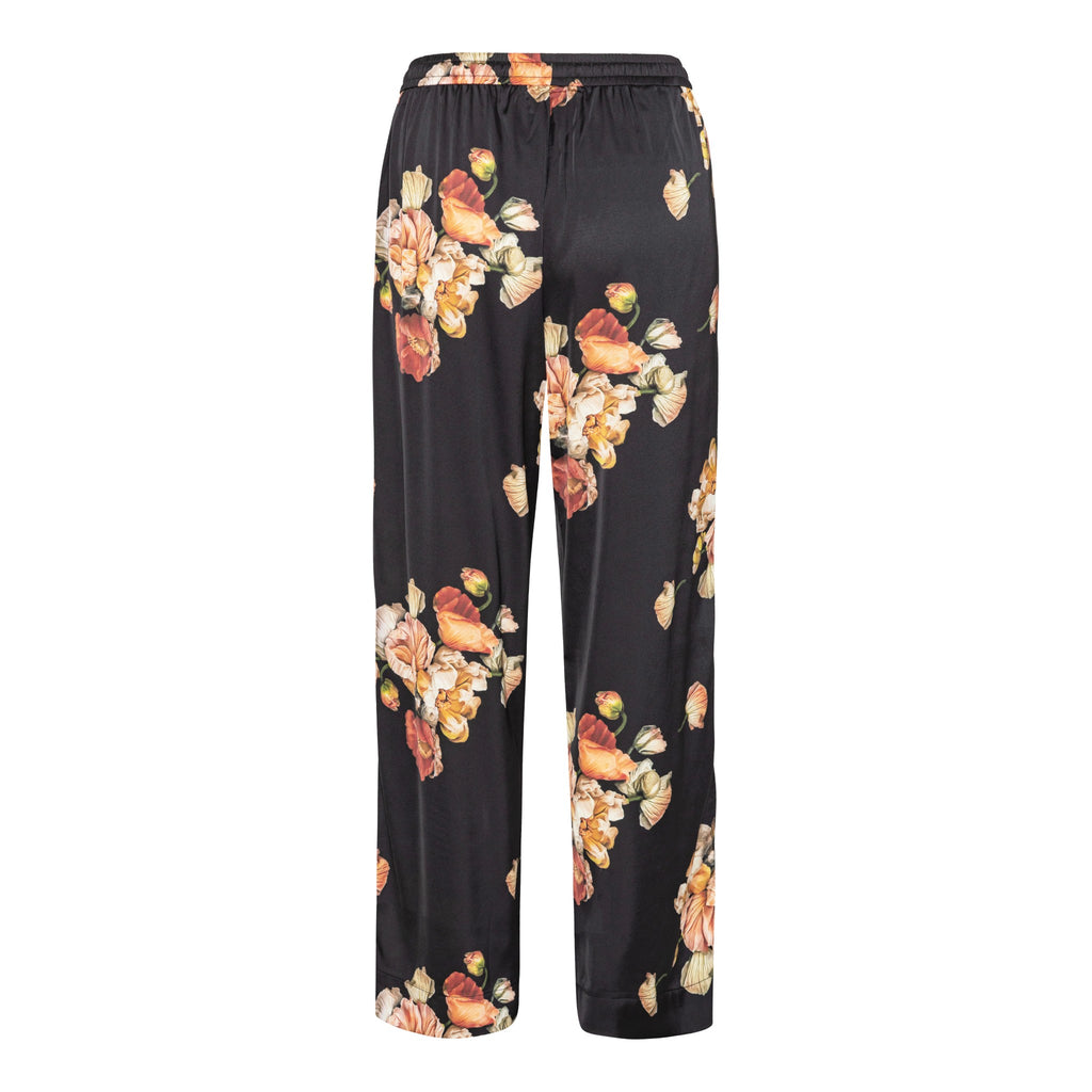 Skønne bukser fra Karmamia i deres velkendte eksklusive metervare, som både er strygefri og farveægte. Bukserne har vidde i benene, to skrålommer og elastik med snøre i taljen. Og så er de i det smukkeste efterårsprint på en sort baggrund.