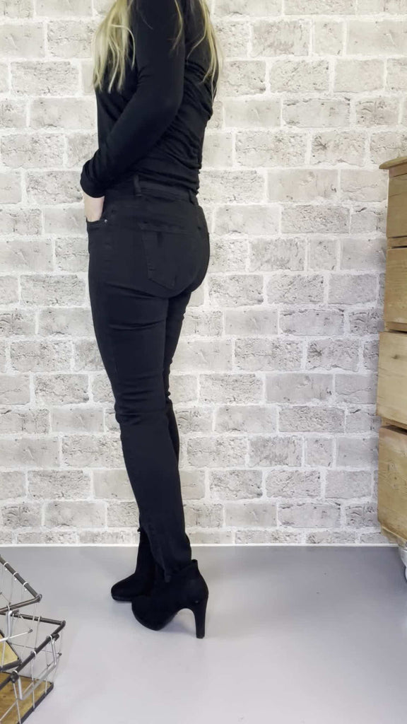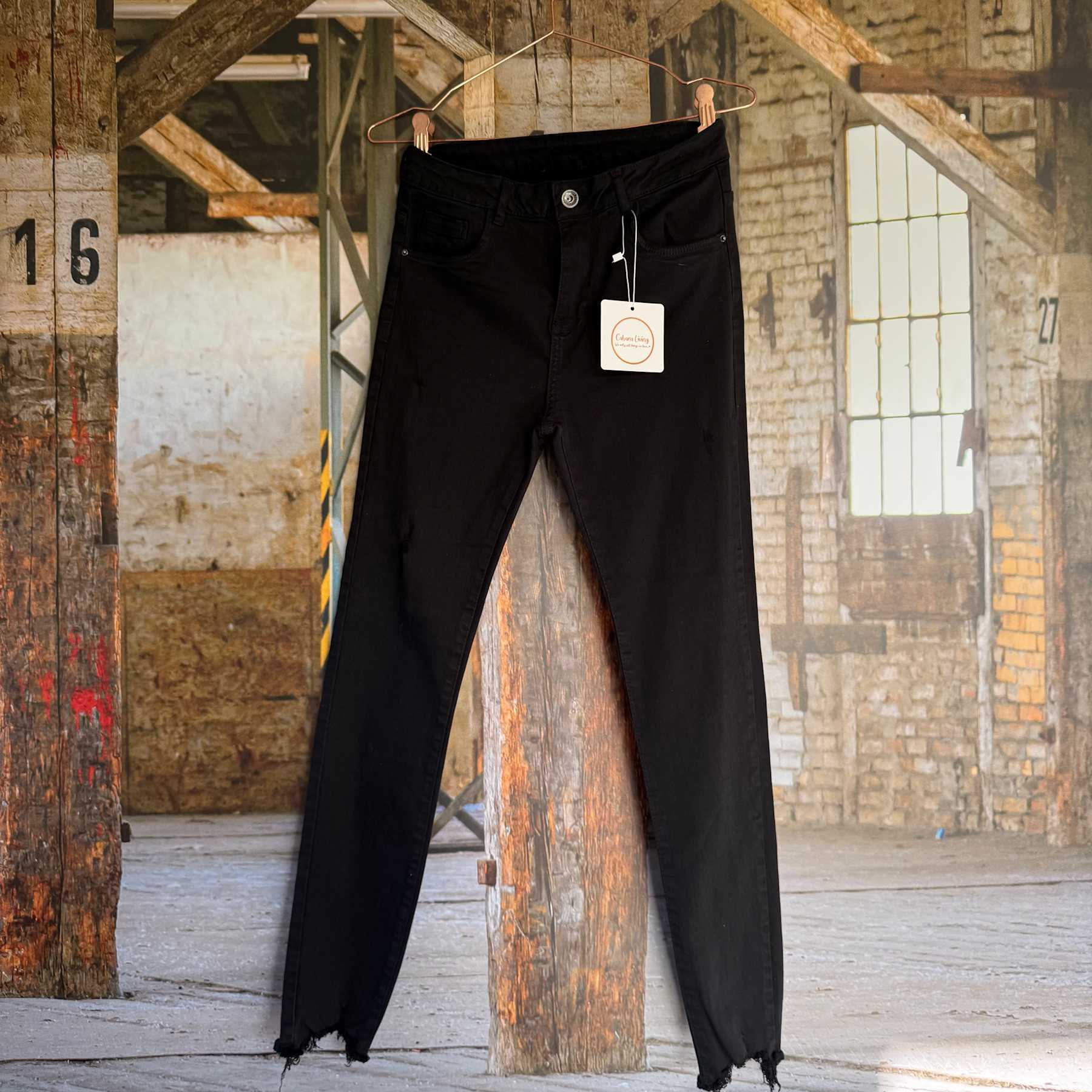 Skinny jeans er tilbage! Og Cabana har leveret den sejeste sort jeans, helt skinny, højtaljet og med en rå flosset kant forneden.