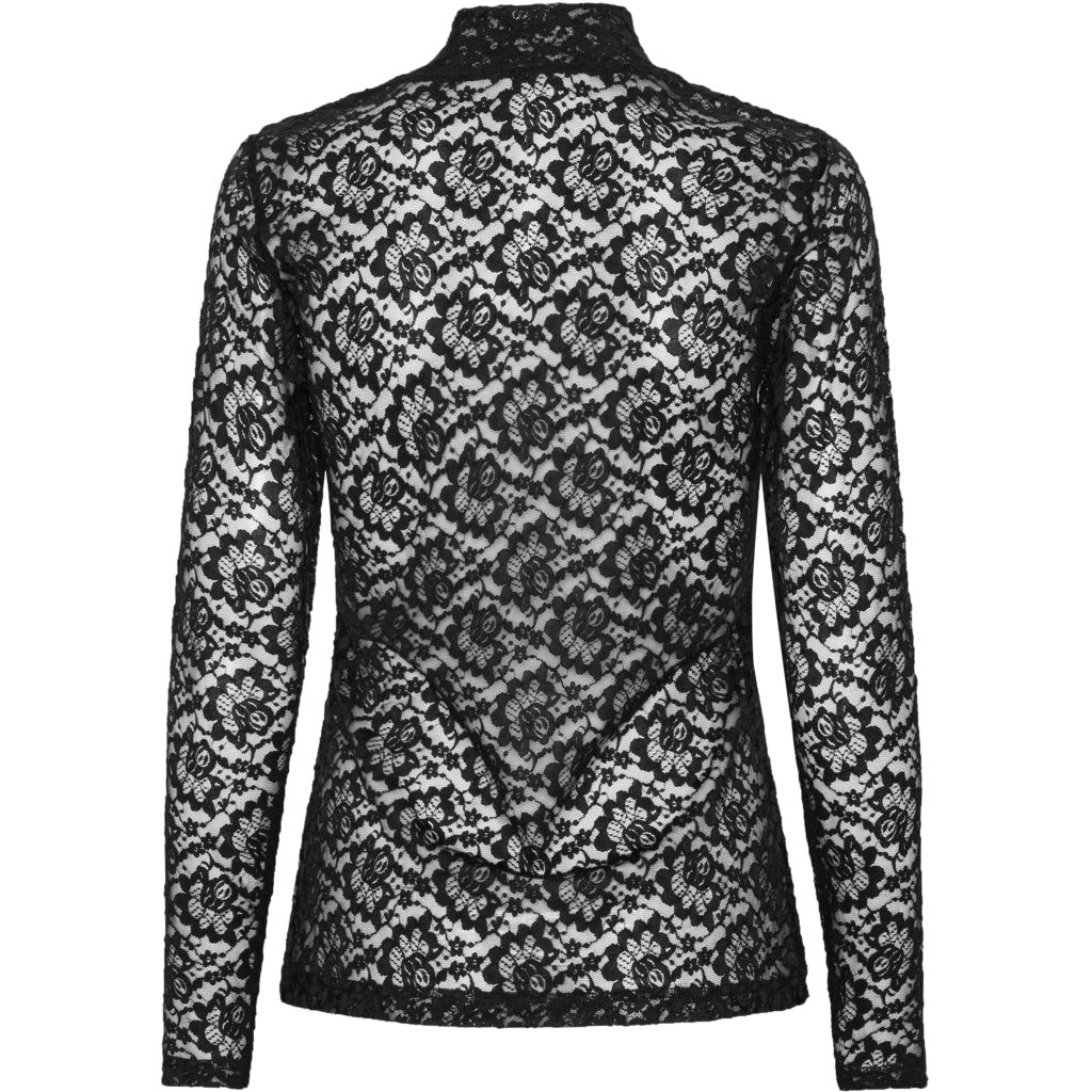 Elegant og feminin blondebluse. Modellen har høj hals (“r-neck”) og lange ærmer og er lavet i en fin blondekvalitet, der giver et let gennemsigtigt udtryk. Den har en slim pasform, der følger kroppens konturer uden at være stram.