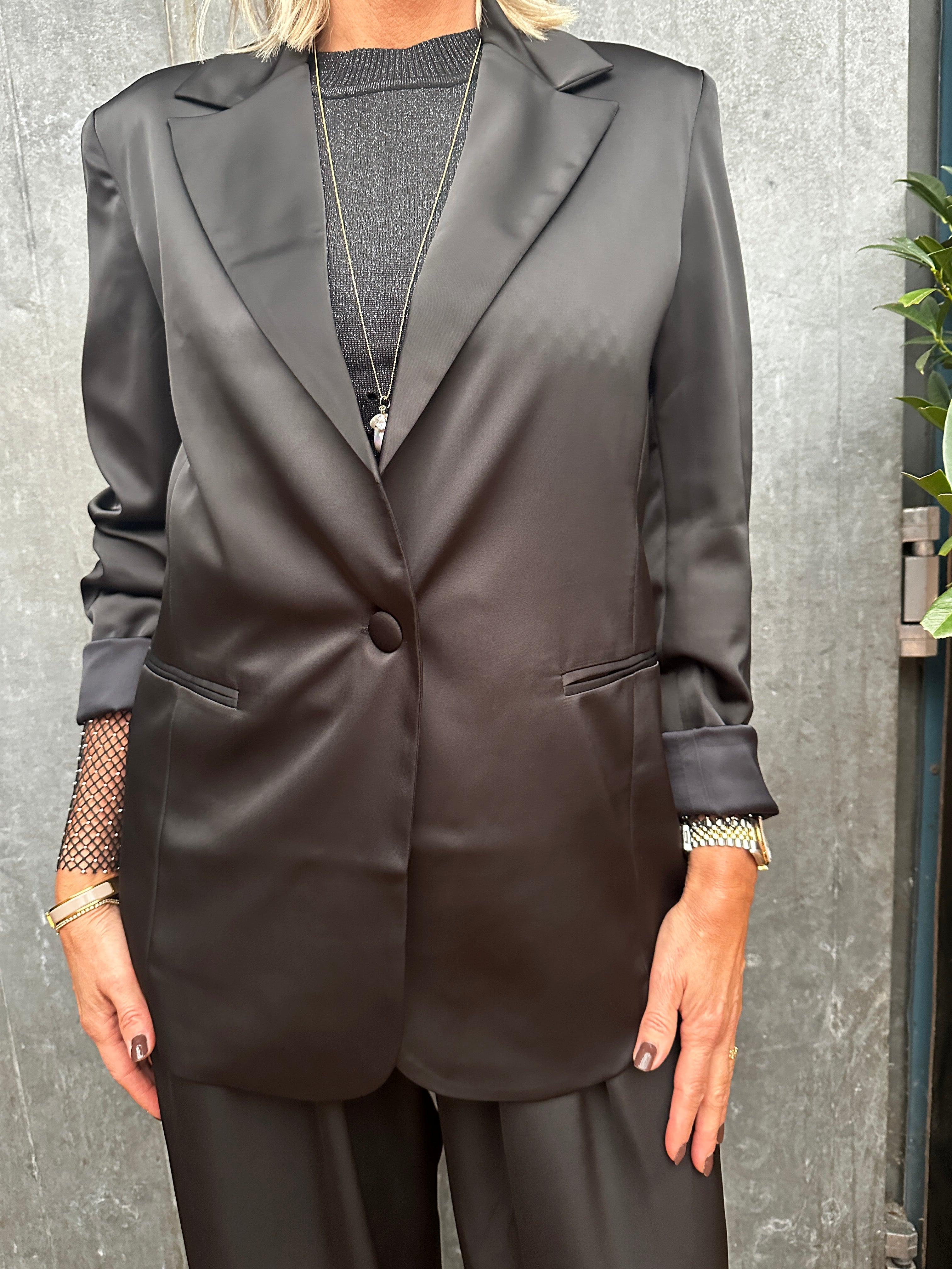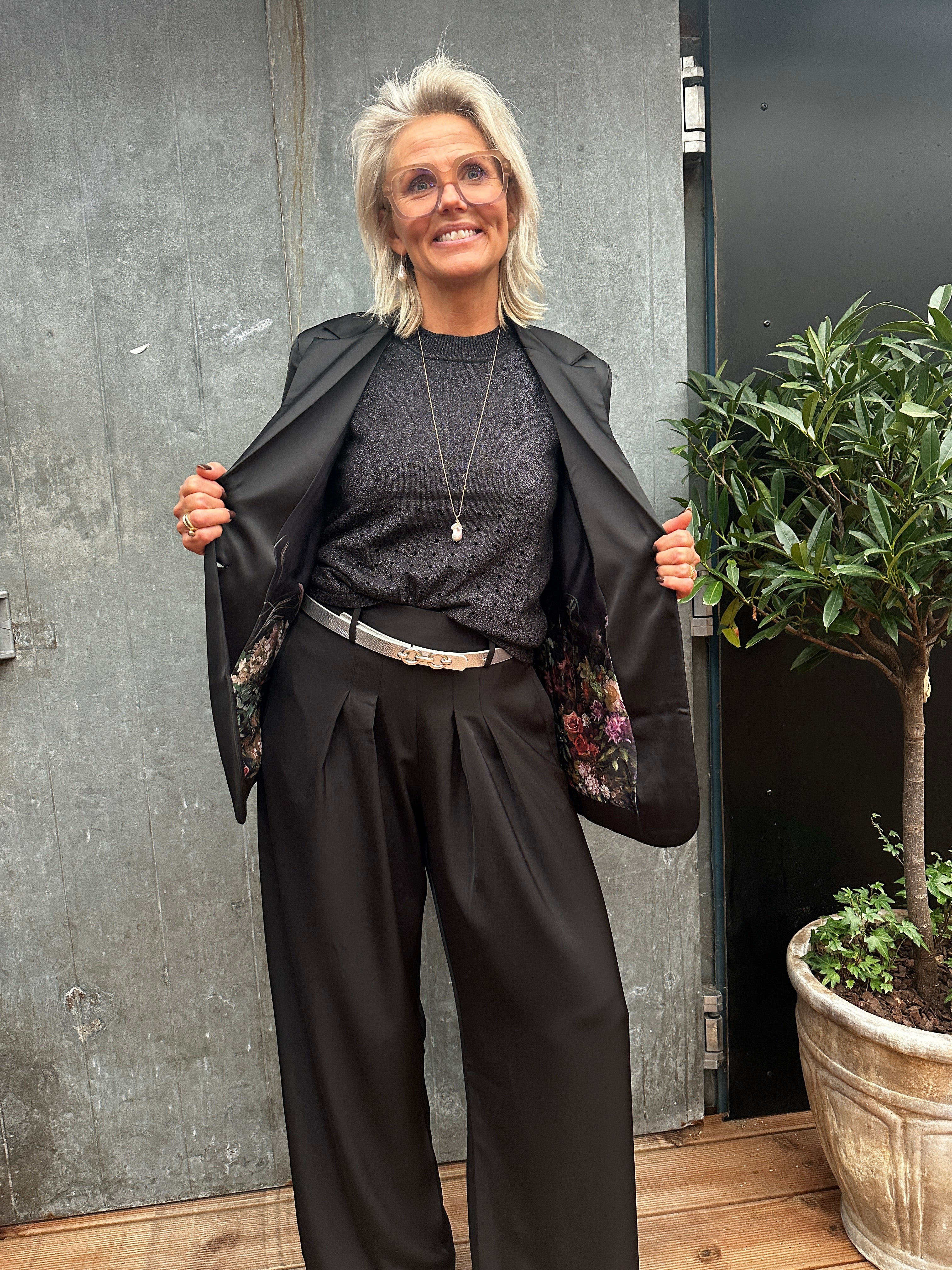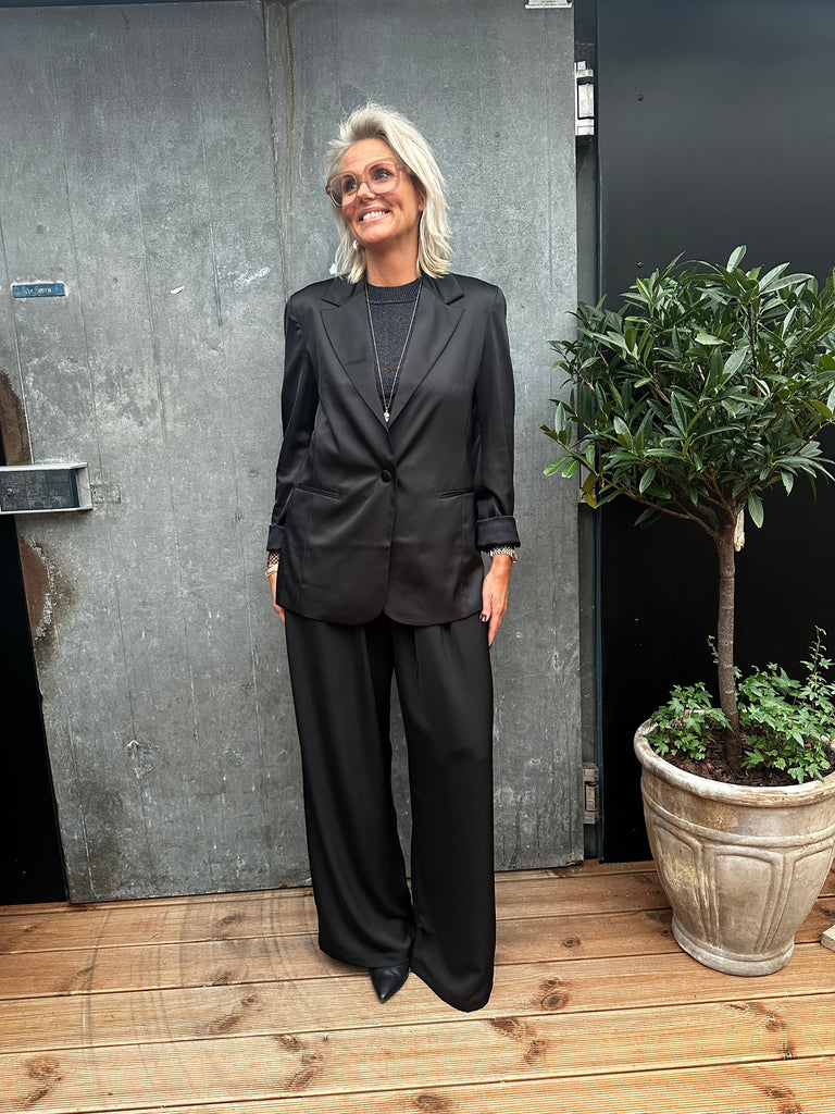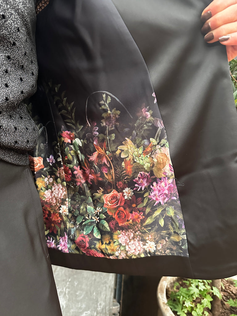 Miller blazeren er en limited edition med kun få stykker tilgængelig i forskellige kombinationer af mønstret eller ensfarvet look. Denne model kommer i helt klassisk sort, i den smukkeste kraftige satin kvalitet, og har så et super eksklusivt for med blomster print. Jakken har en let oversized pasform, enkelradet knappelukning og lommer.