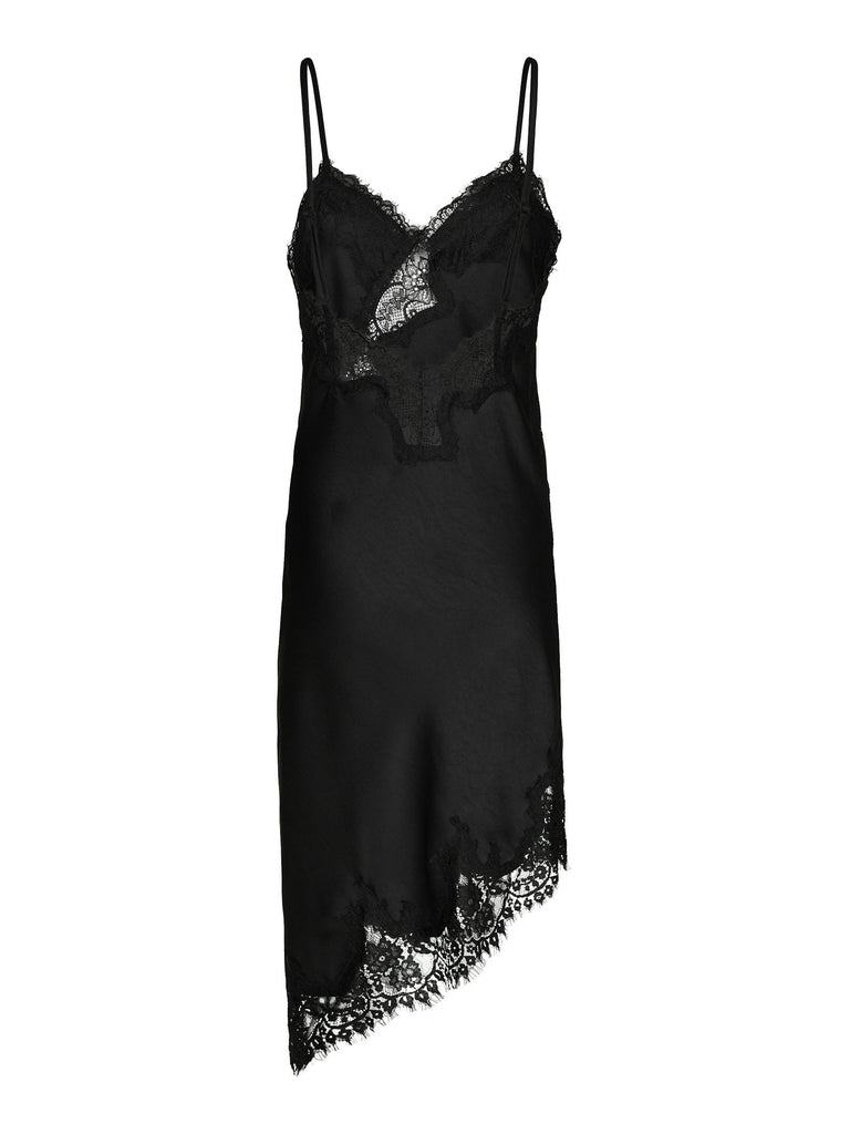 Den fineste feminine kjole med blonde detaljer i en assymetrisk pasform. Kjolen kommer i en fin satin kvalitet og har regulerbare stropper. Den er super cool stylet over jeans, skindbukser og lignende, og evt med en blazer over, så den titter frem som en ekstra lækker detaljer.