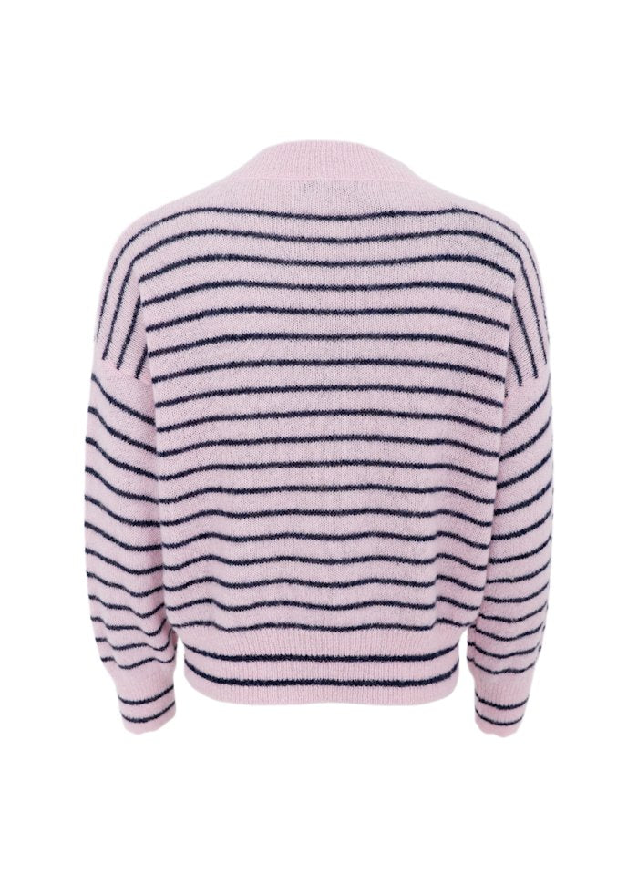 Blød og stilfuld stribet striktrøje fra Black Colour med V-udskæring. Trøjen har en smuk rosa bundfarve med fine, horisontale striber i en varm kontrastfarve. Pasformen er let oversize med afslappede skuldre og lange ærmer, hvilket giver et casual og moderne udtryk.