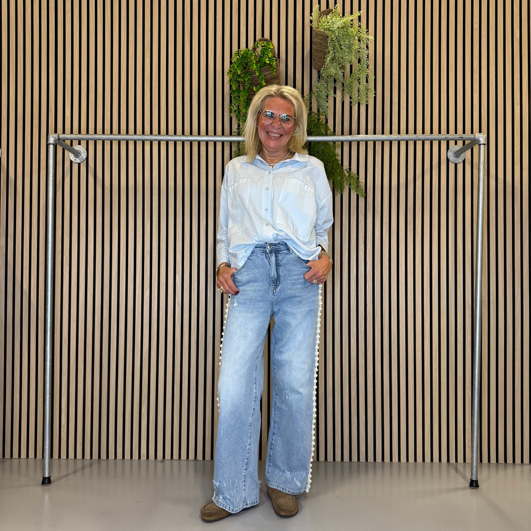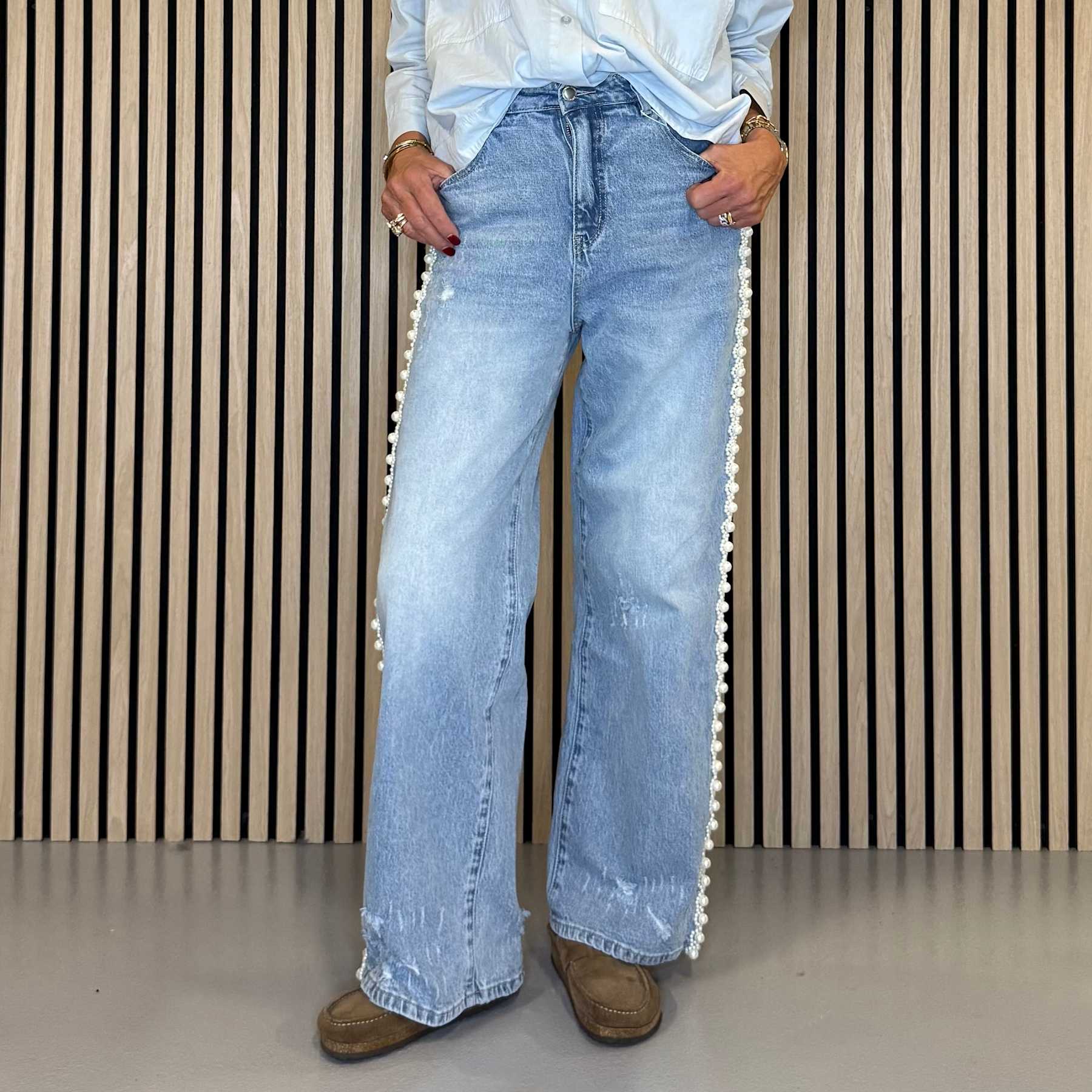 Super cool jeans nyhed fra Cabana Living i en lækker lys denimvask og med smukke perledetaljer ned langs siden, samt lidt rå slid detaljer i bunden. De har en god pasform med forholdsvis høj talje og let stretch, som giver god bevægelighed og et flatterende look. Materialemixen gør dem bløde og holdbare, og de kan nemt styles både afslappet og mere pænt til hverdag eller arbejde.