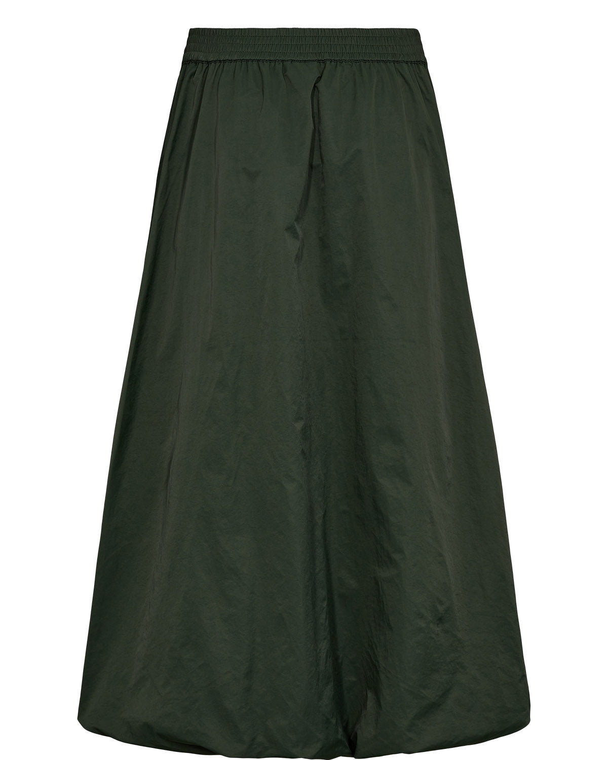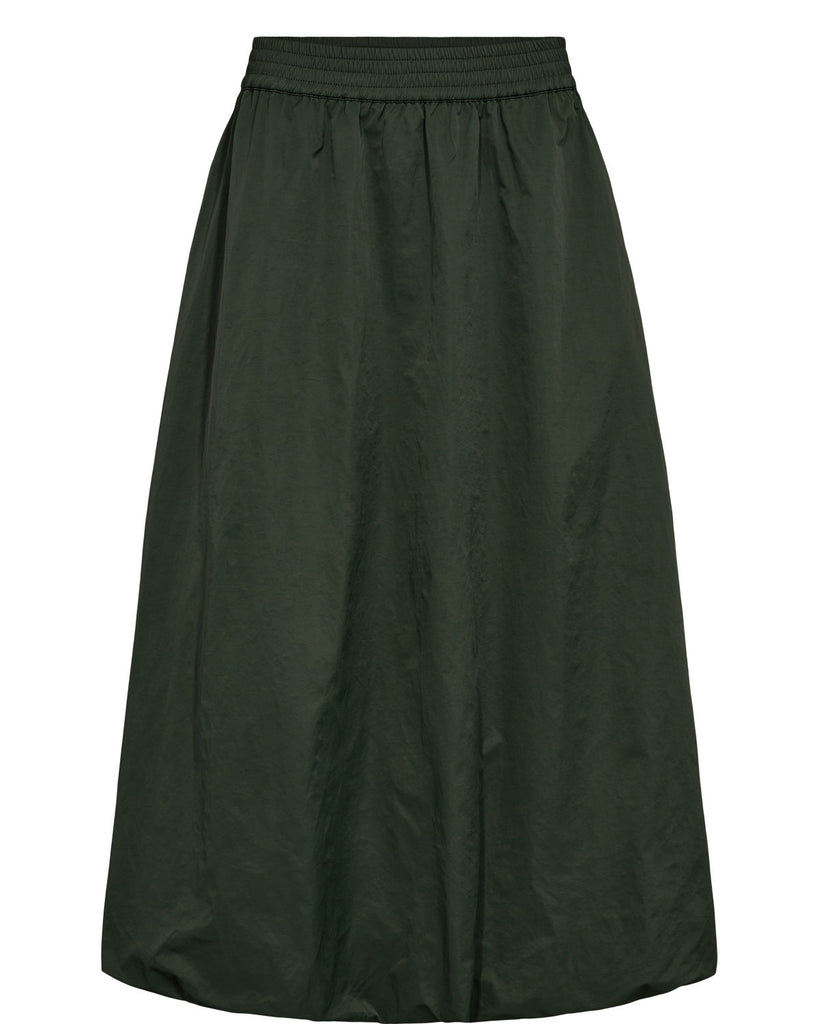 Nederdelen er formet som en klassisk “balloon skirt” — det vil sige med en voluminøs, lidt puffet silhuet, der giver et feminint og legende look. Den har et elastisk bånd i taljen og lommer i begge sider.