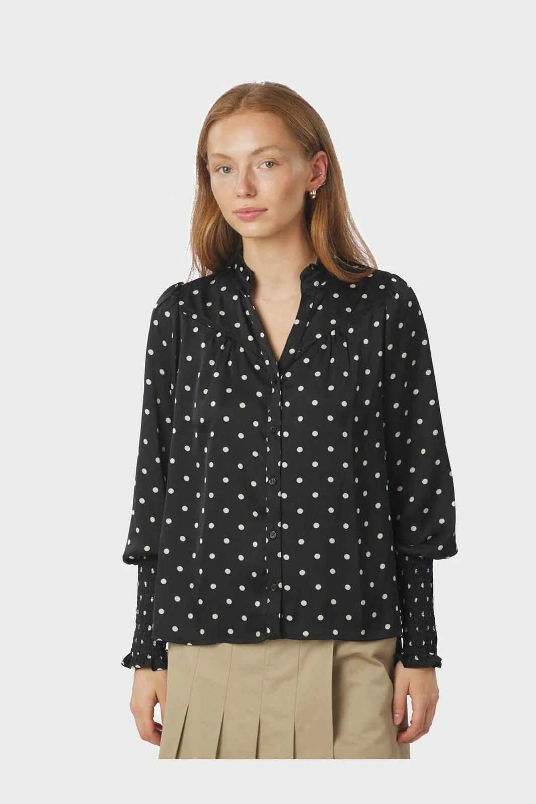 En lækker sort bluse fra Neo Noir med hvide prikker. Blusen har V-hals, knaplukning foran og flæsedetaljer ved kraven. Der er et lækkert ribbet bånd nede ved håndleddet, som giver en super fed style.
