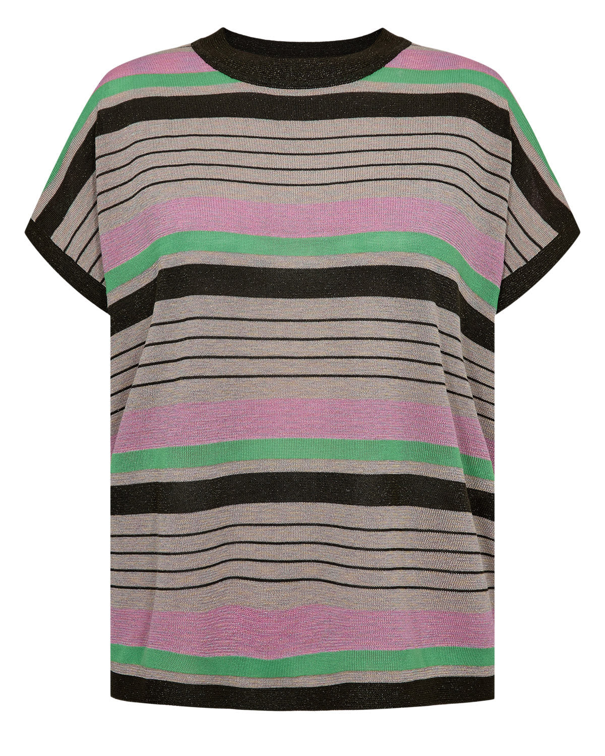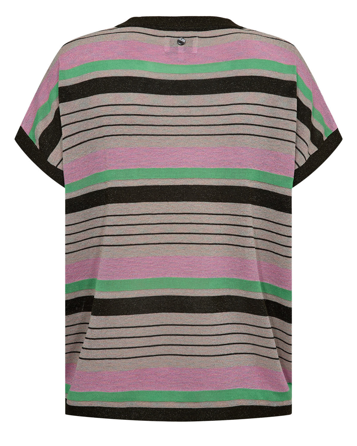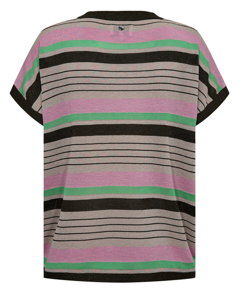 Nümph Laura Darlene Pullover er en let og blød strikbluse med korte ærmer og et farverigt, moderne stribemønster. Farverne består af en neutral mushroom-base, kombineret med grønne, pink og sorte striber, som giver et frisk og legende udtryk. Materialet er en behagelig blanding af 76 % Lenzing viskose, 16 % polyester og 8 % lurex, hvilket tilføjer en diskret glimmer-effekt i stoffet. Pasformen er løs og afslappet, perfekt til både hverdagsbrug og et mere farverigt, casual look.