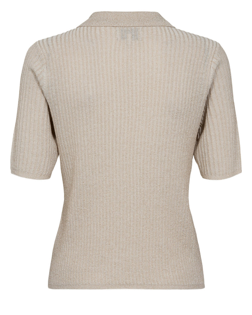 Nümph Mimi Pullover er en elegant og let strikket polo med korte ærmer og et feminint, ribstrikket mønster. Den kommer i farven Cloud Dancer, en lys og varm beige tone, som giver et rent og sofistikeret udtryk. Blusen har en klassisk polokrave med tre knapper foran og en figursyet, men behagelig pasform, der gør den både stilfuld og nem at kombinere med både bukser, nederdele og shorts.