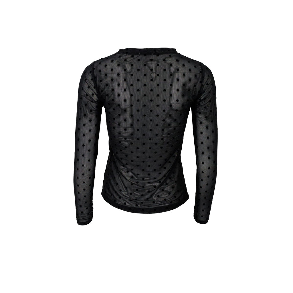 Skøn mesh bluse fra Black Colour i en flot sort farve med prikker. Pasformen er tætsiddende.