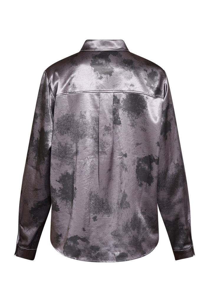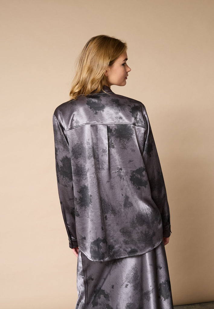 Love1426-4 er en klassisk satin skjorte med et grafisk design. Skjorten har klassisk krave og knappelukning, samt 2 brystlommer. Den er så lækker at have på.