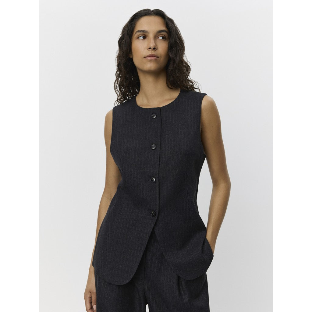 Top cool klassisk vest med rund halsudskæring og gennemknappet. Vesten har nålestriber og en figursyet pasform med åbning forneden.