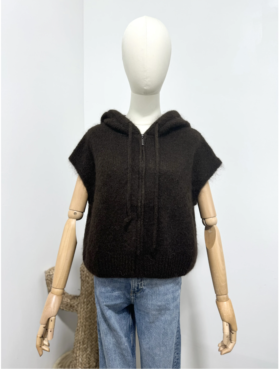 Denne ærmeløse vest med hætte er fremstillet i kid mohair og kendetegner sig med sin bløde, lette og naturligt varme kvalitet. Det enkle design fuldendes af en lynlås foran, som tilfører både funktionalitet og et moderne udtryk.
