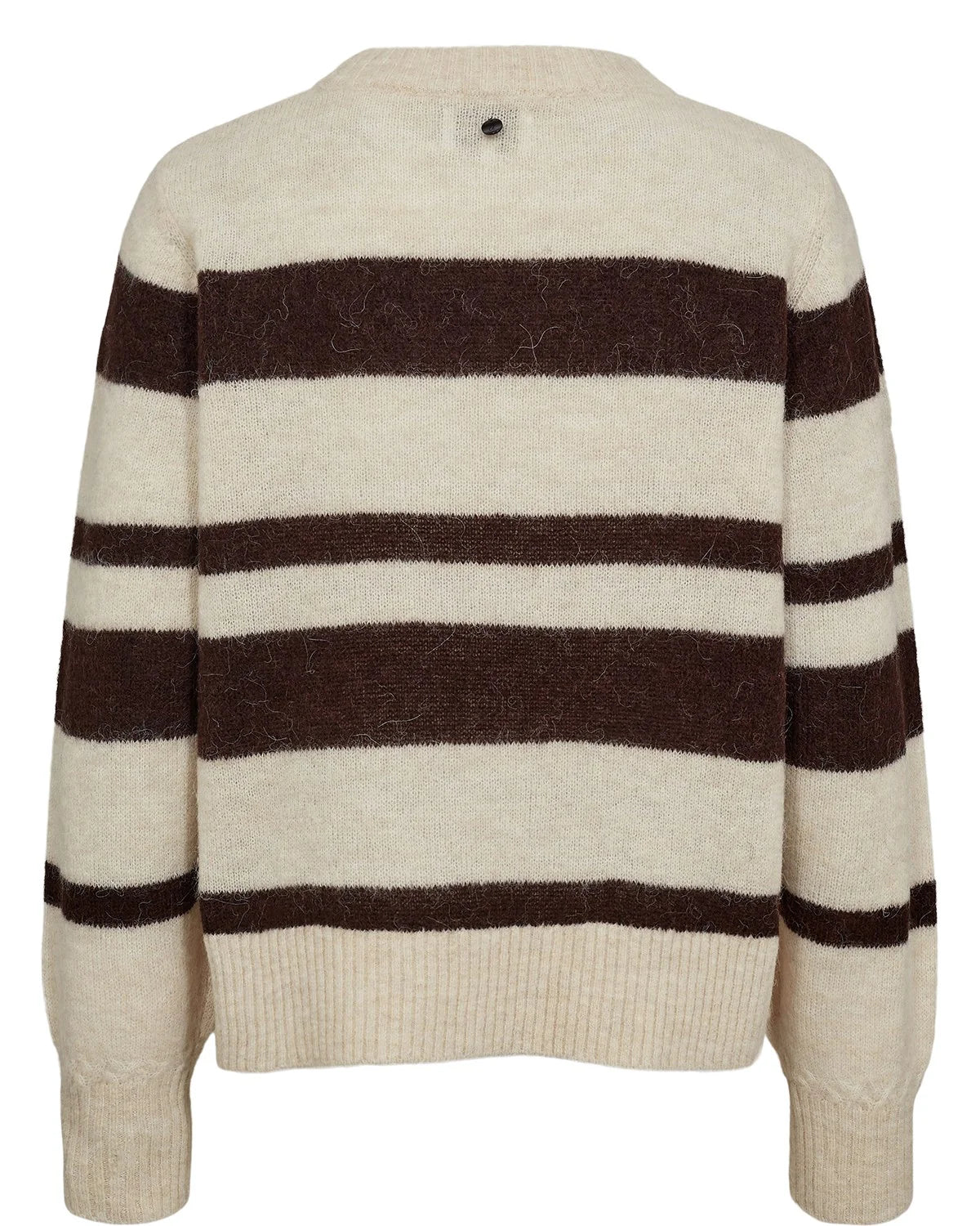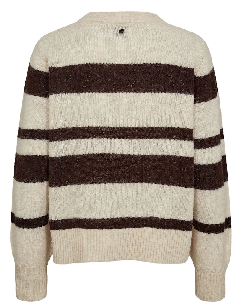 Denne striktrøje er en blød og varm pullover i et klassisk, tidløst design. Den er strikket i en lækker kvalitet med uld og alpaka, som giver en dejlig blød og behagelig fornemmelse mod huden. Pulloveren har et afslappet snit med rund halsudskæring og ribkant ved hals, ærmer og forneden. Den har et flot, stribet mønster i neutrale farver, som gør den let at style til både jeans, nederdele og bukser.