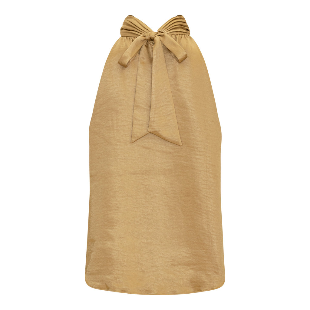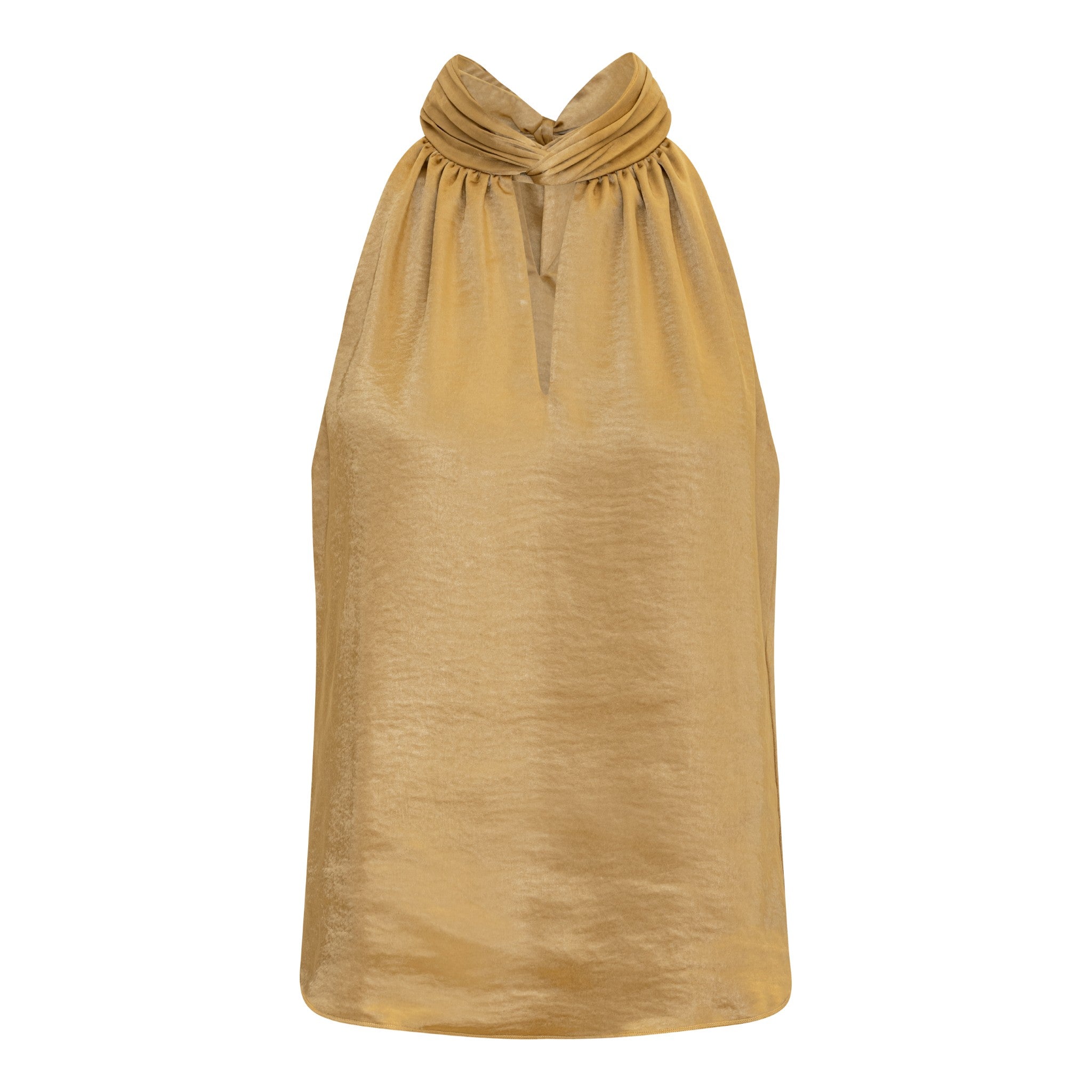 Stilfuld halter-neck top med lavt V-snit og smukke flæseeffekter rundt om halsen - nu i den smukkeste guldfarve. Style den til et par jeans for et cool look, ellers med de matchende guld bukser får et genneført og elegant look.