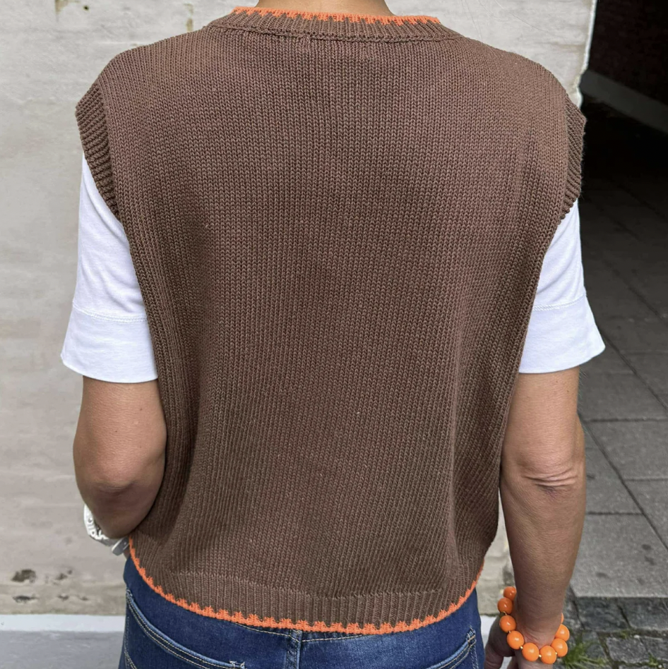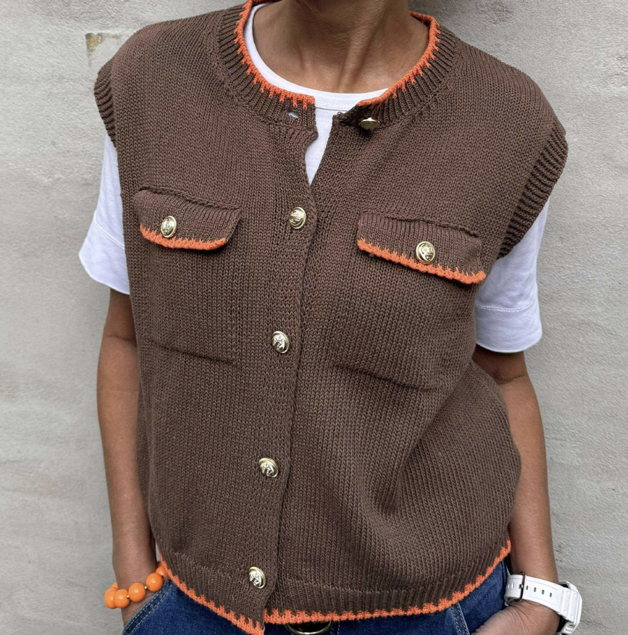 Denne brun strikkede Giletta vest fra NOT SISTERS, er en elegant og moderne tilføjelse til enhver garderobe. Den varme, chokolade brune farve bringer liv og stil til dine outfits, mens de dekorative guldknapper foran tilfører et eksklusivt og feminint touch. Vesten har en flatterende, let boxy pasform og små brystlommer, der giver et sofistikeret og velgennemtænkt udtryk.