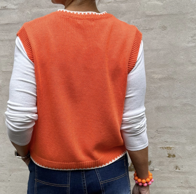Denne orange strikkede Giletta vest fra NOT SISTERS, er en elegant og moderne tilføjelse til enhver garderobe. Den varme, glødende orange farve bringer liv og stil til dine outfits, mens de dekorative guldknapper foran tilfører et eksklusivt og feminint touch. Vesten har en flatterende, let boxy pasform og små brystlommer, der giver et sofistikeret og velgennemtænkt udtryk.