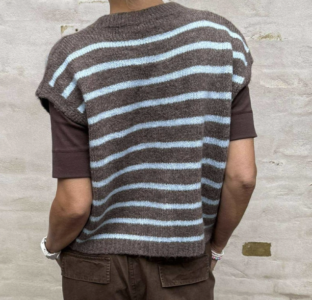 Vigga Knit Vest fra Not Sisters er en skøn, strikket vest med et klassisk og hyggeligt udtryk. Den er designet i en blød uldblanding med brede, vandrette striber i brune og lyseblå nuancer, der giver et frisk og moderne twist til den tidløse stil. Vesten har en afslappet pasform og lukkes med fine knapper foran, hvilket gør den nem at style både åben og lukket. Ribkanter i hals, ærmegab og bund giver et flot finish og sikrer, at vesten holder sin form.