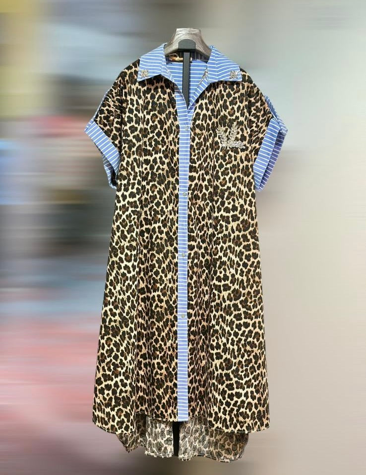 lang skjortekjole fra Aroma i fed kontraster med striber og leopard. Kjolen har korte ærmer ig er i en skøn bomuldskvalitet og med similisten. Skjorten er længere bagtil.