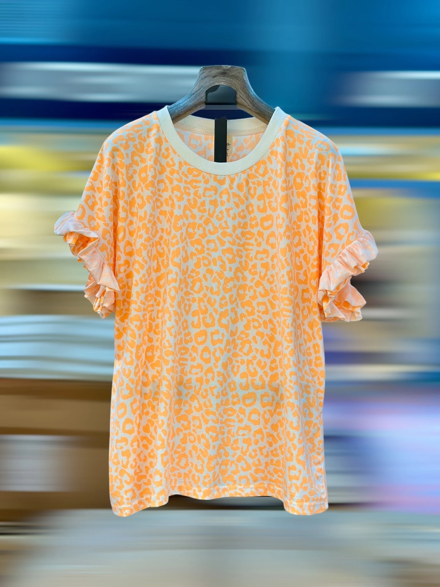 Sød t-shirt fra Aroma i orange leopardprint. T-shirten er i en blød bomuldskvalitet og og fin flæsedetalje på ærmerne.