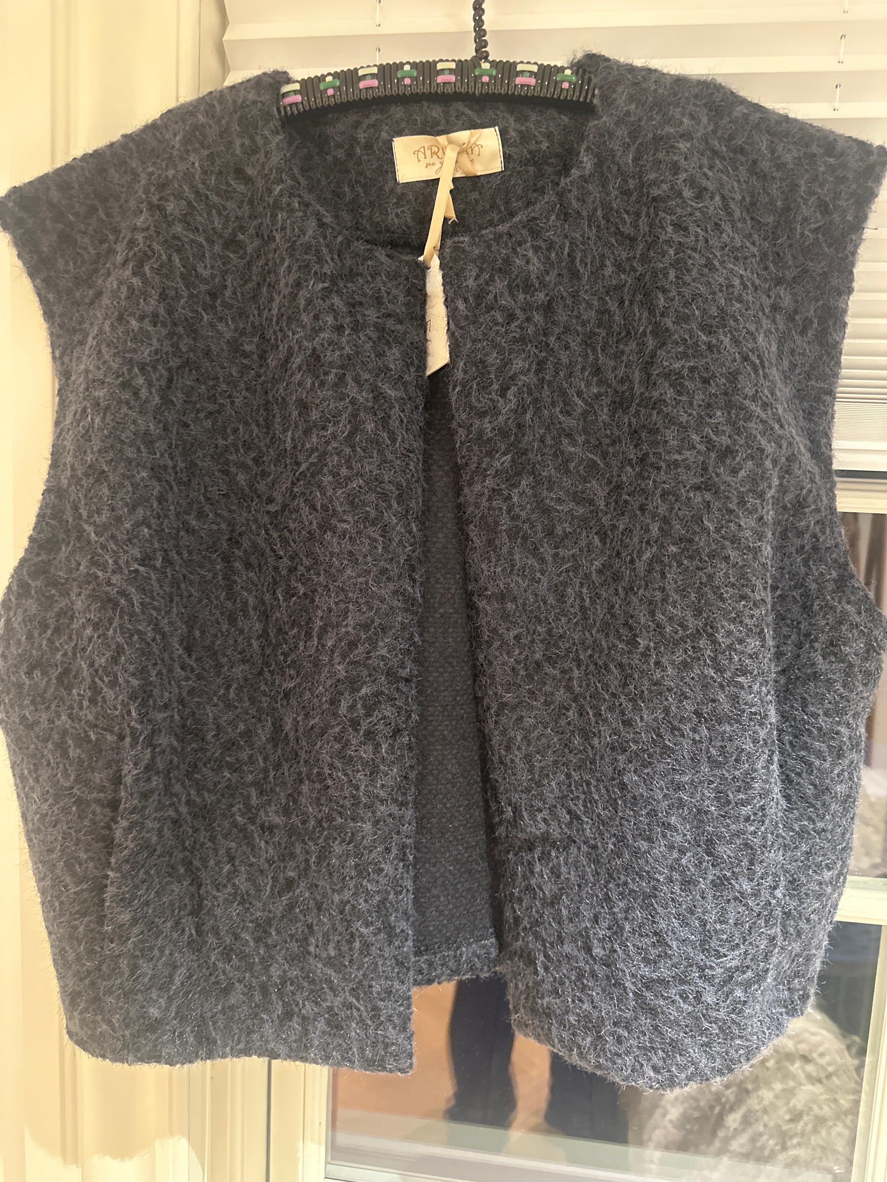 Super cool "filt" vest. Med plads i ærmegab til strik osv indenunder. Lige op og ned pasform dog med et lille snit ind forneden,.