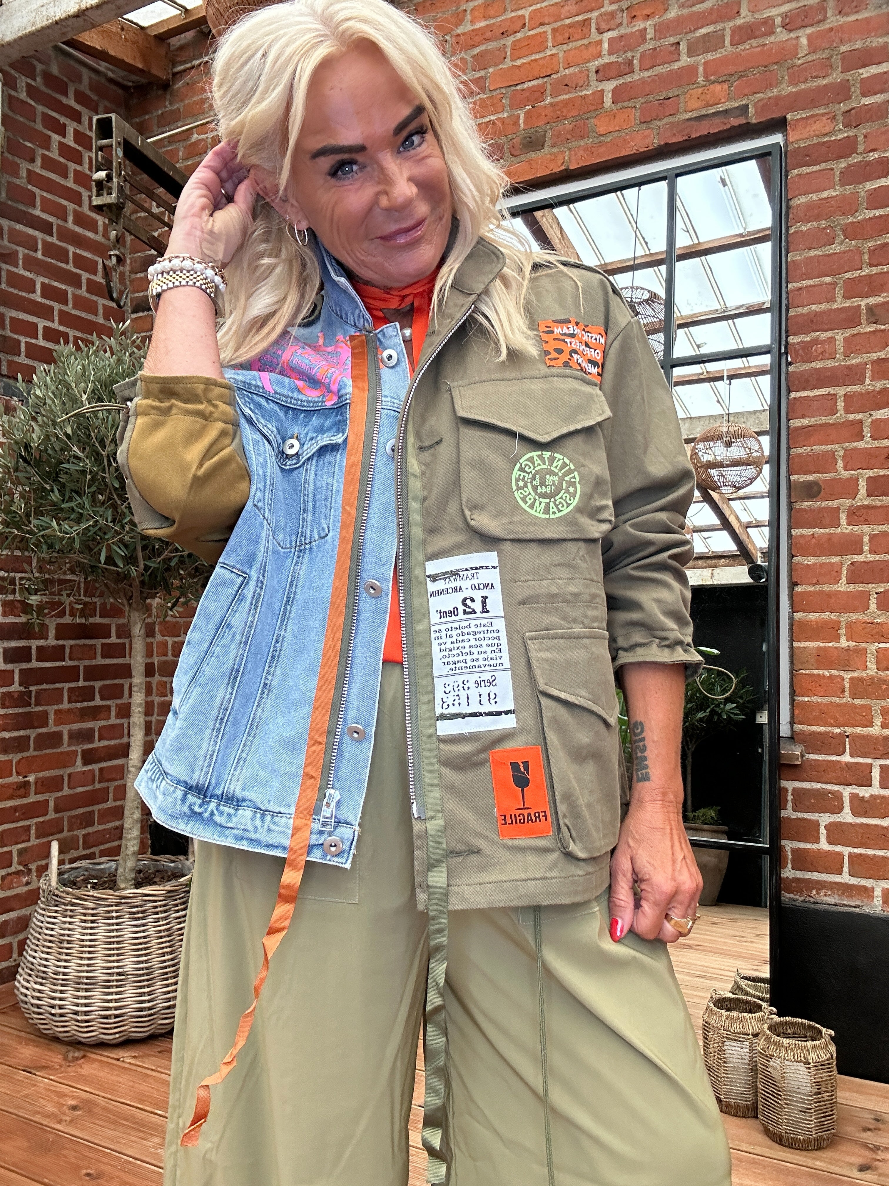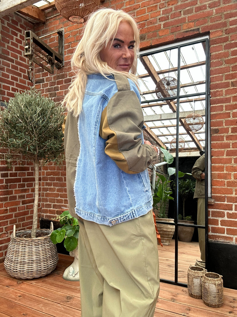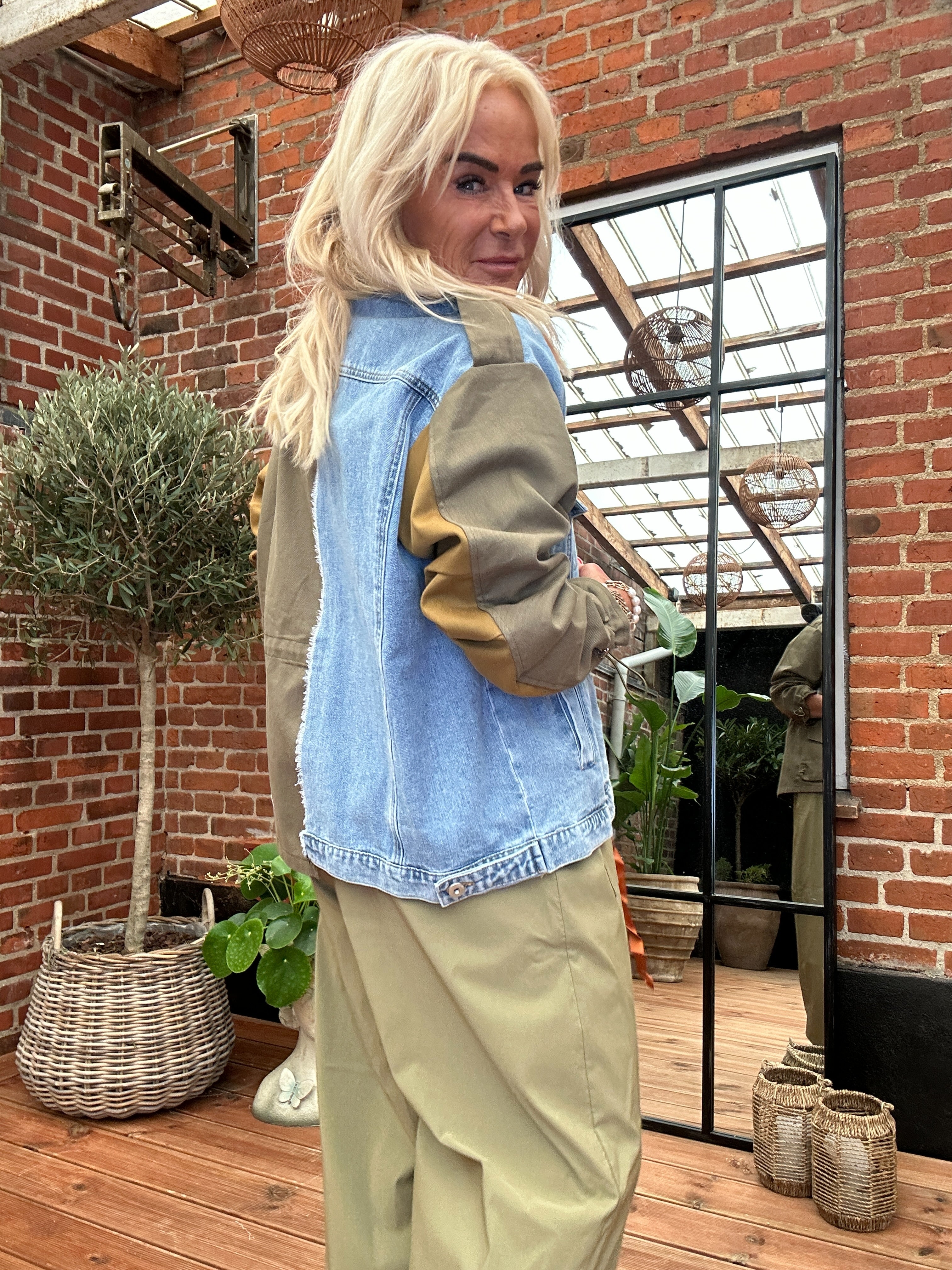 Fedeste militær jakke i en fed kombinationen af armygrøn og en lys denim, der giver en fed kontrast. Jakken er dekoreret med fede patches og rå detaljer.