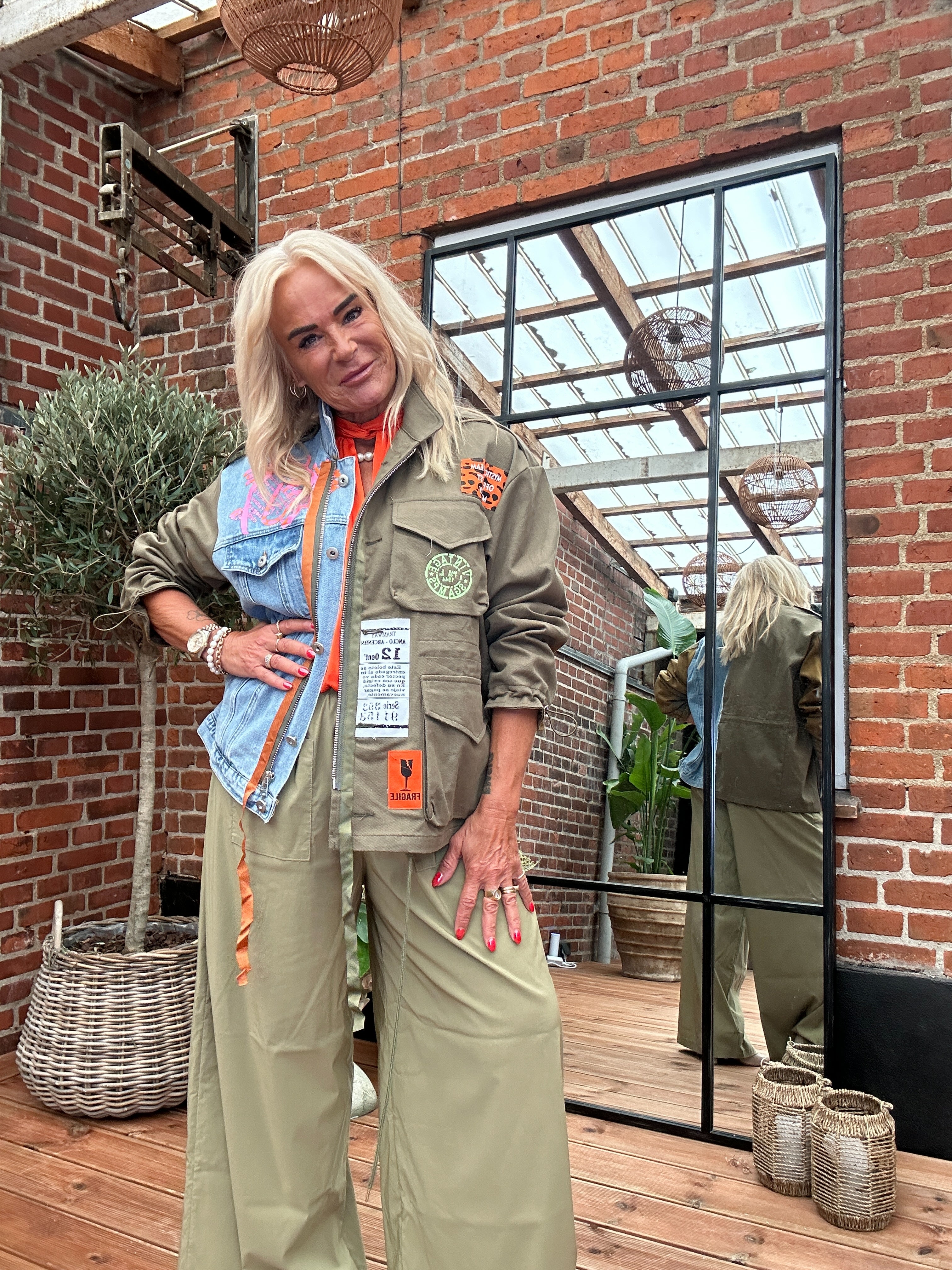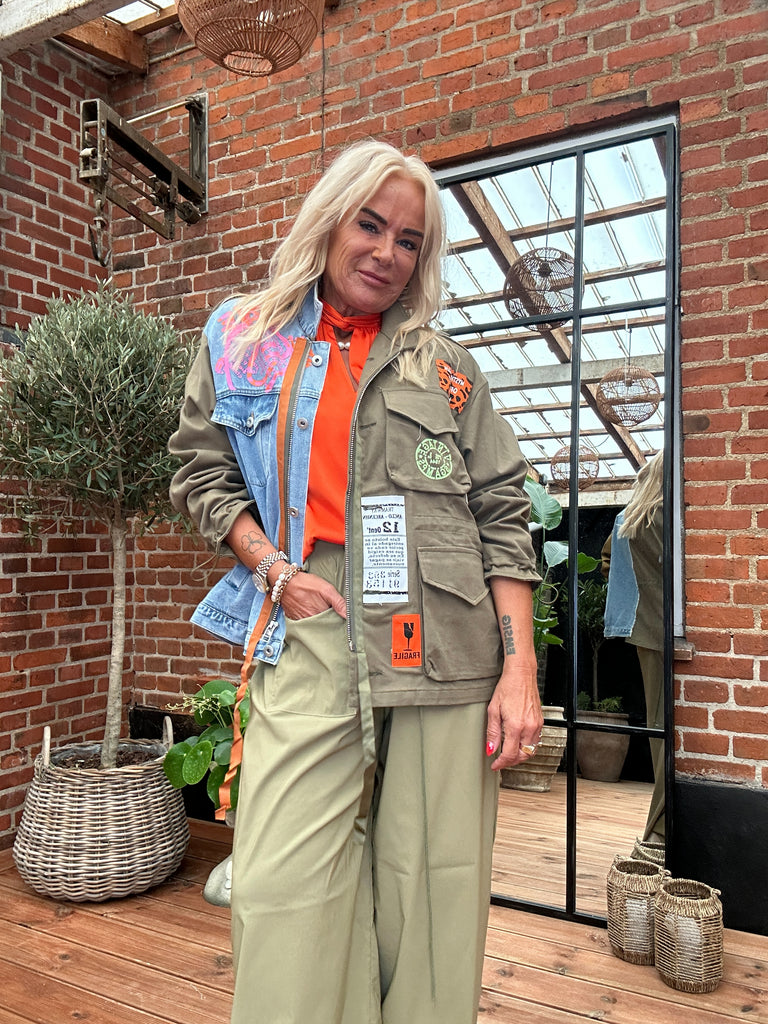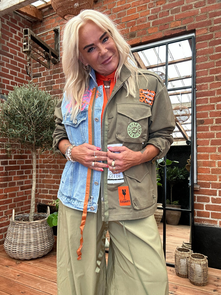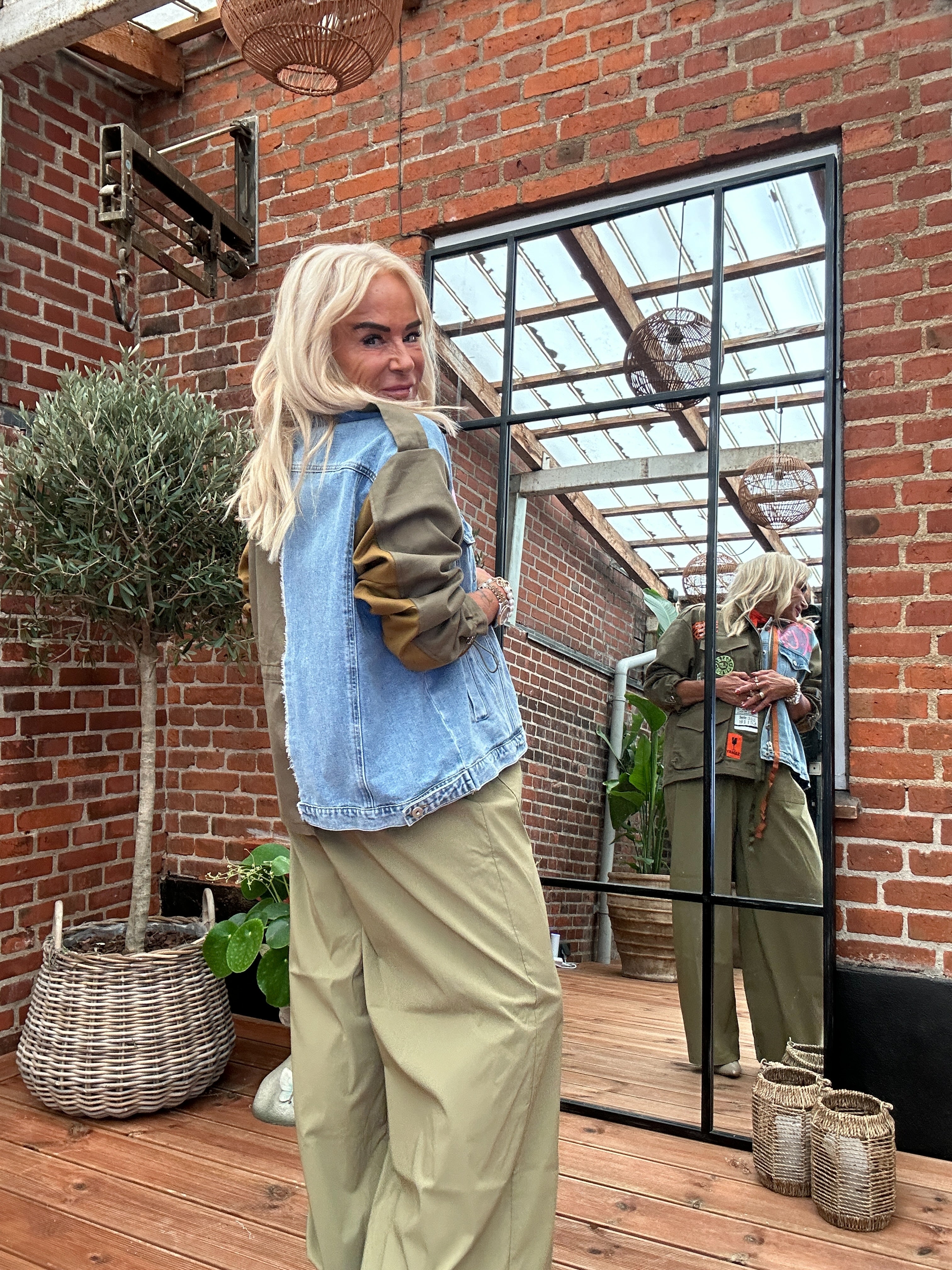 Fedeste militær jakke i en fed kombinationen af armygrøn og en lys denim, der giver en fed kontrast. Jakken er dekoreret med fede patches og rå detaljer.