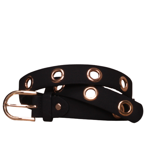 Flot bælte fra Bæltekompagniet i klassisk sort. Bæltet har huller med guld ringe og så er der selvfølgelig guldspænde.
