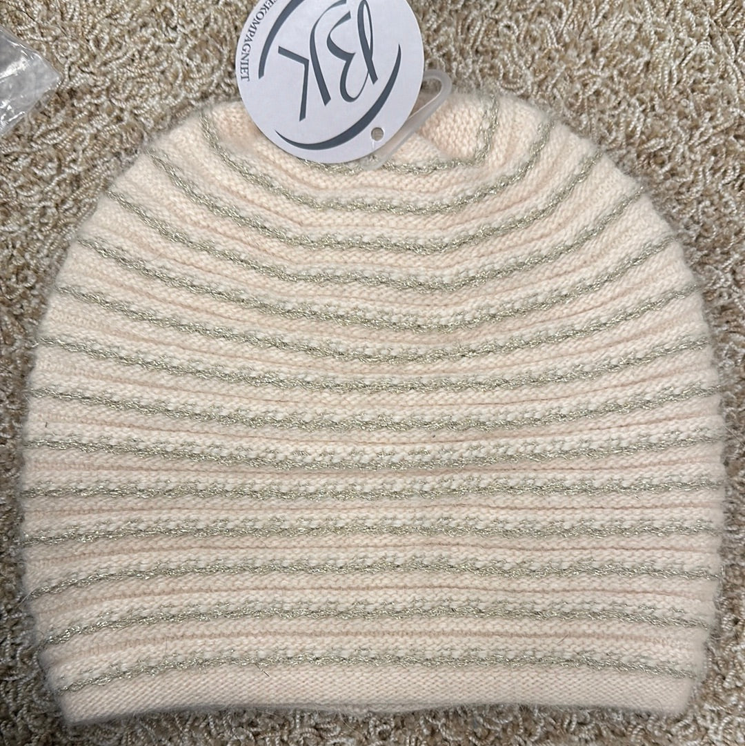 Skønneste hue fra bæltekompagniet i lys beige med guldlurex .