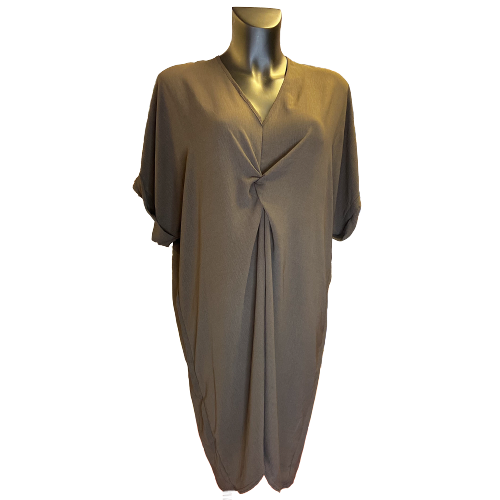 Brun coffee kjole fra Bæltekompagniet. Kjolen har korte ærmer samt v-udskæring og den fineste detalje foran ved brystet. Kjolen er onesize og falder pænt naturligt.