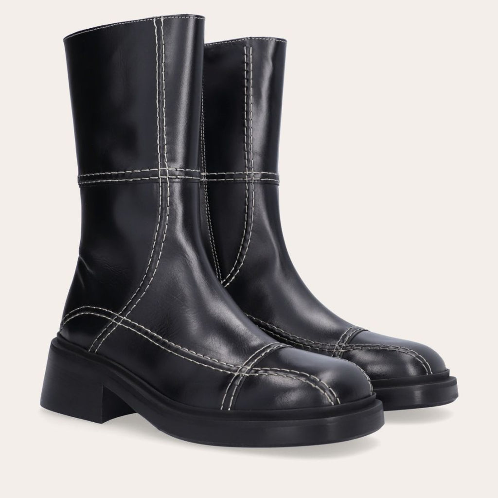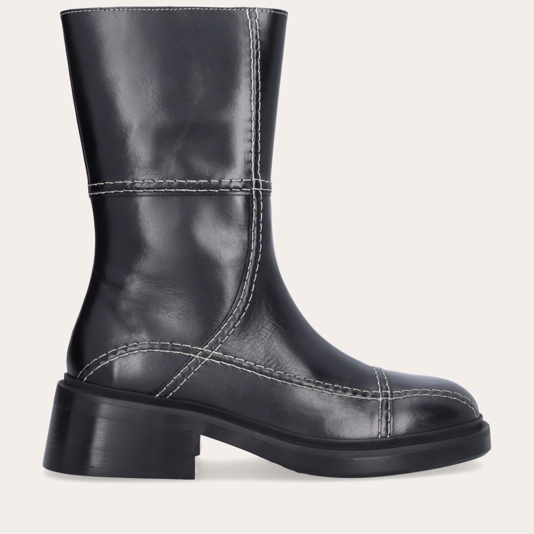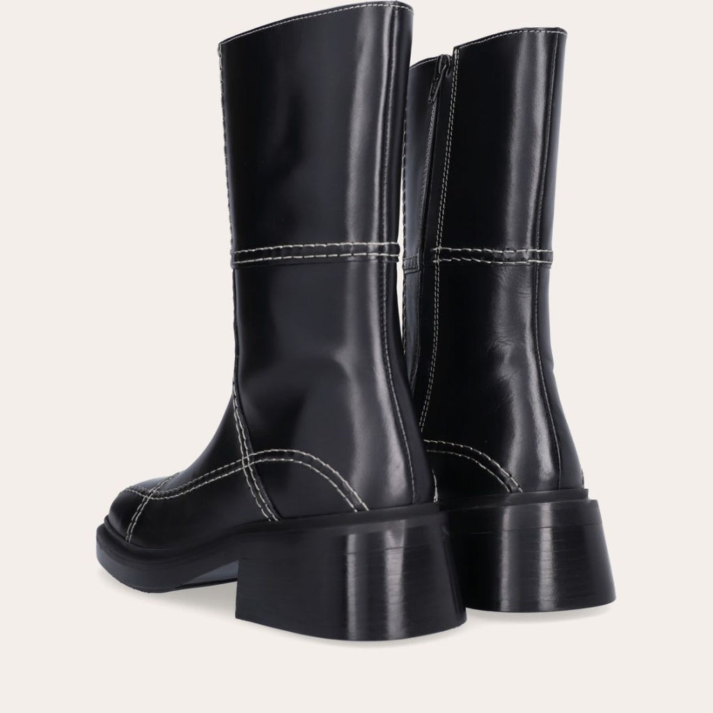 Håndlavet støvle, udført i sort glat skind med rund tå. Støvlen er dekoreret med offwhite stikninger på forfoden og om skaftet. Støvlen har en lynlås på indersiden.