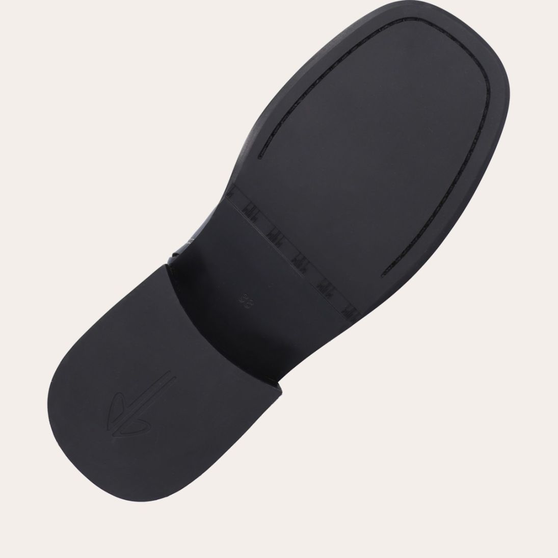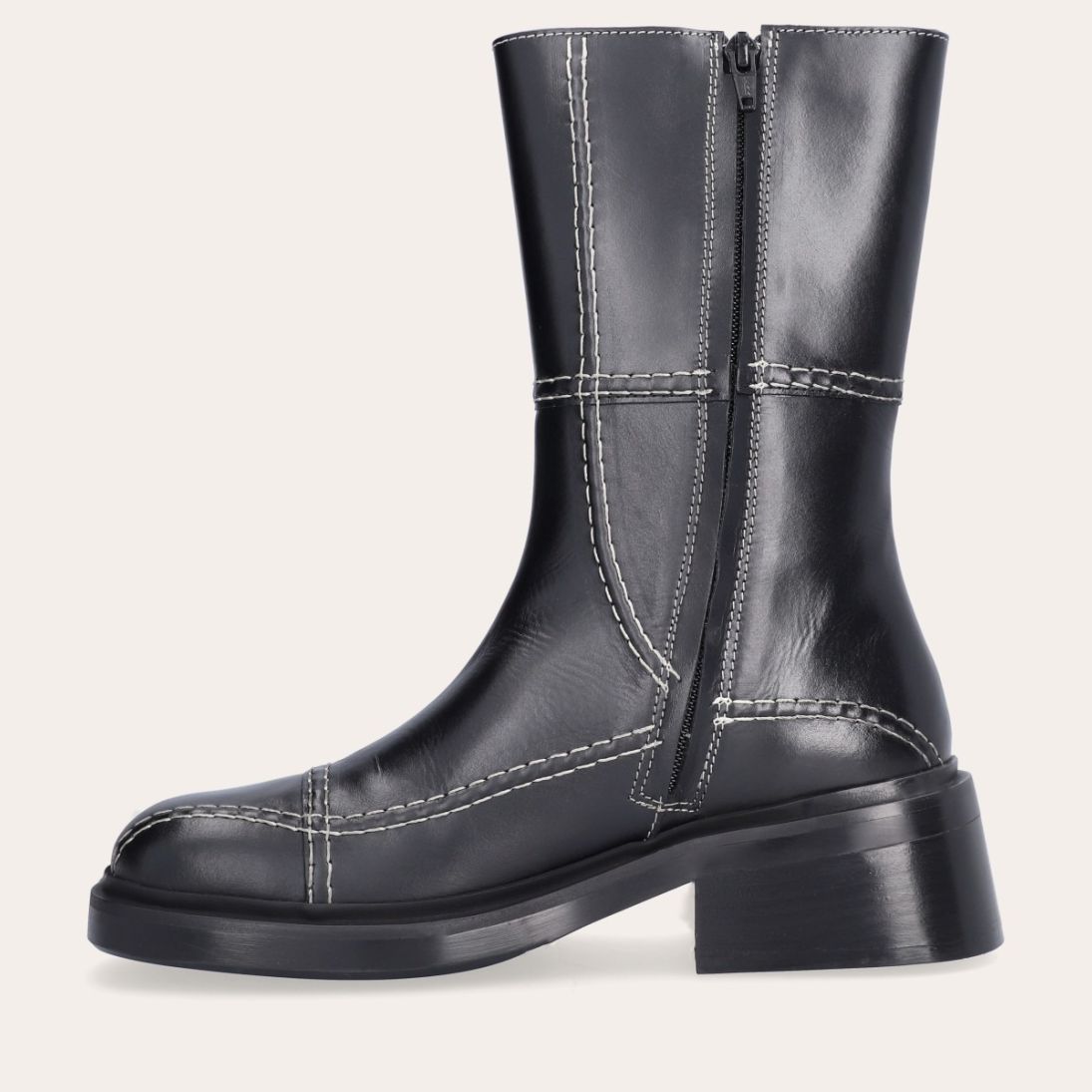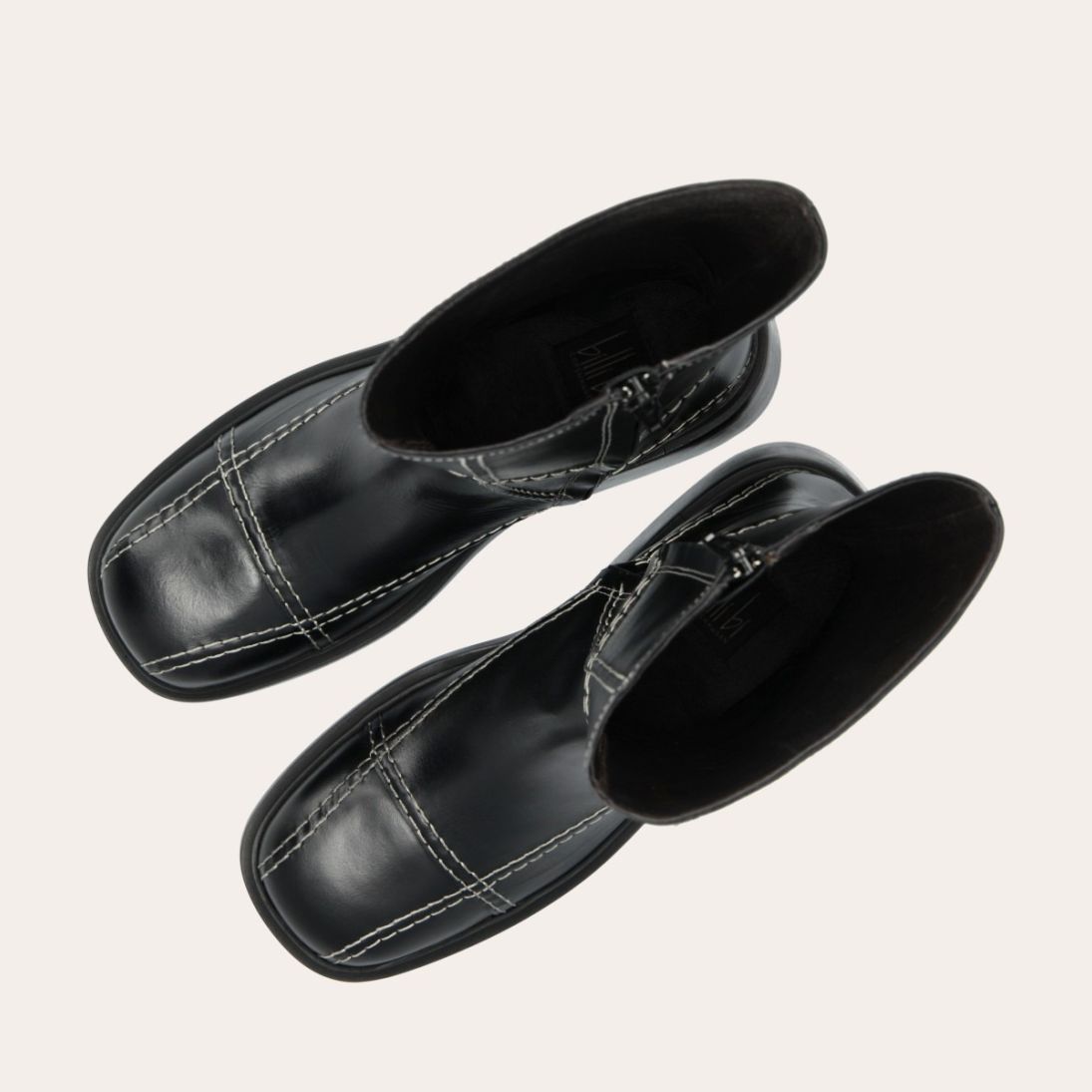 Håndlavet støvle, udført i sort glat skind med rund tå. Støvlen er dekoreret med offwhite stikninger på forfoden og om skaftet. Støvlen har en lynlås på indersiden.