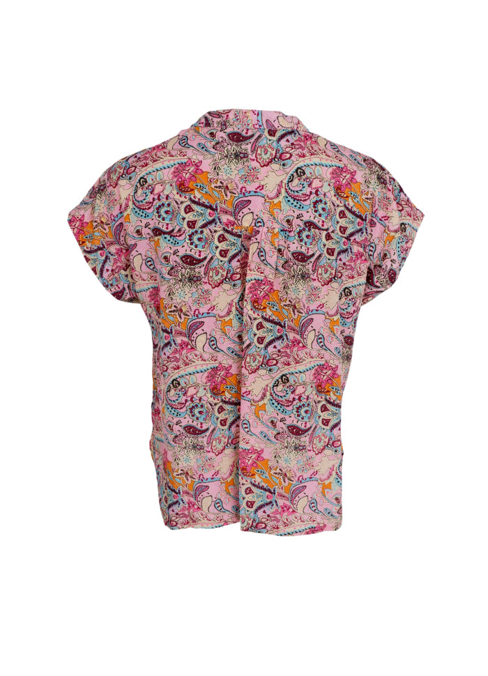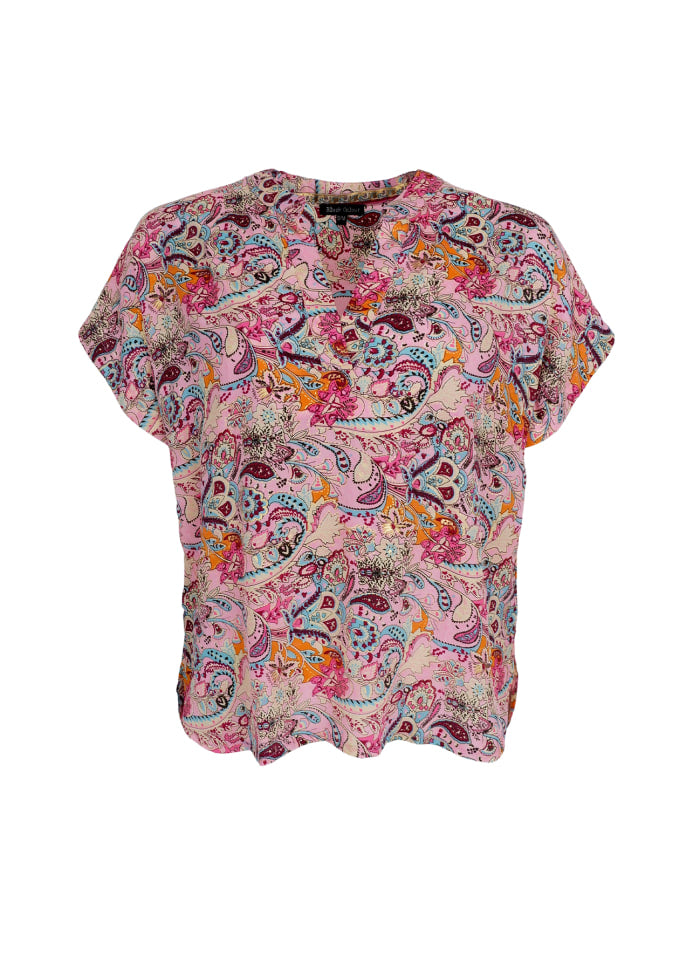 V-hals bluse m. korte ærmer i det smukkeste mønster.