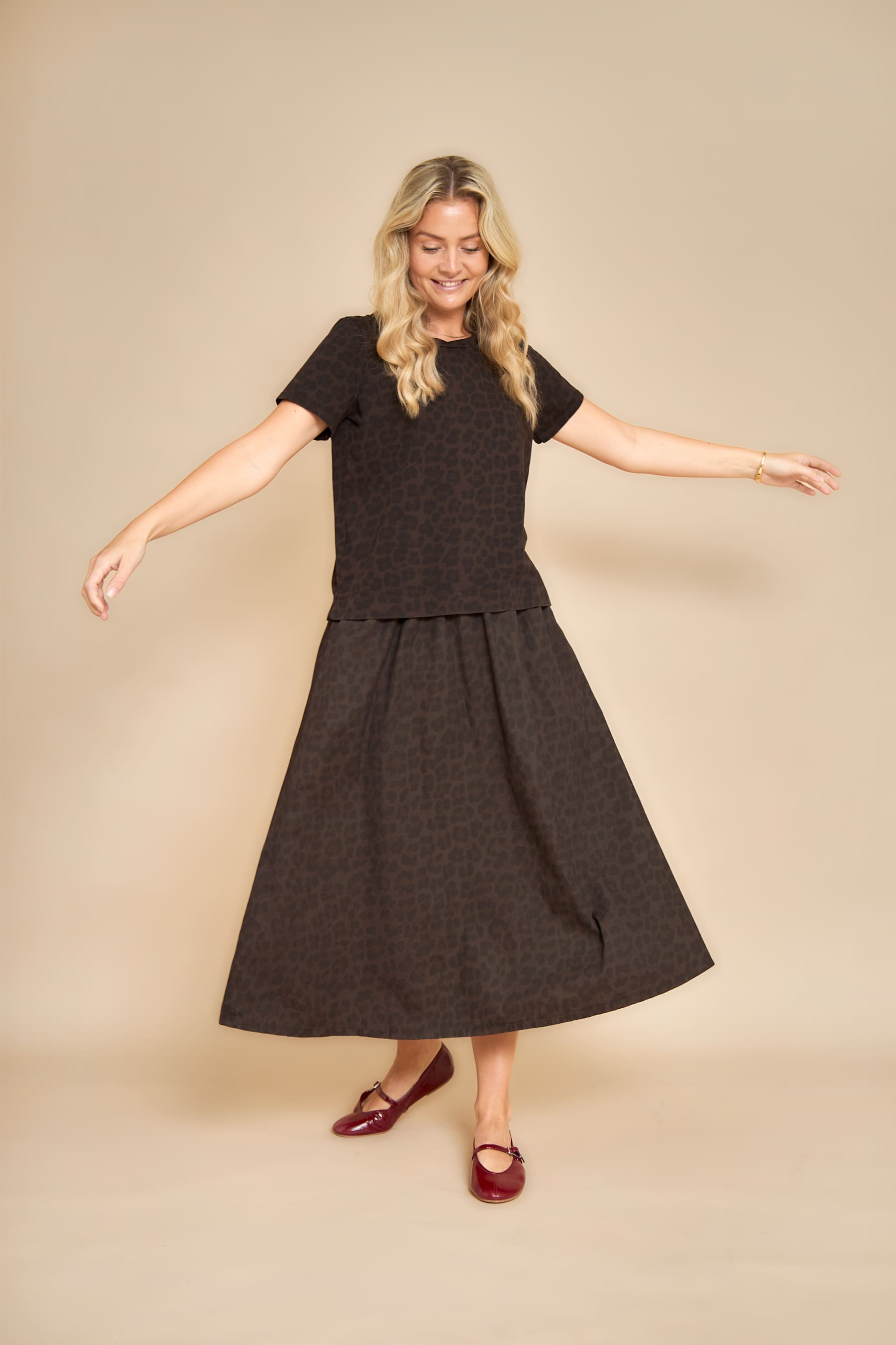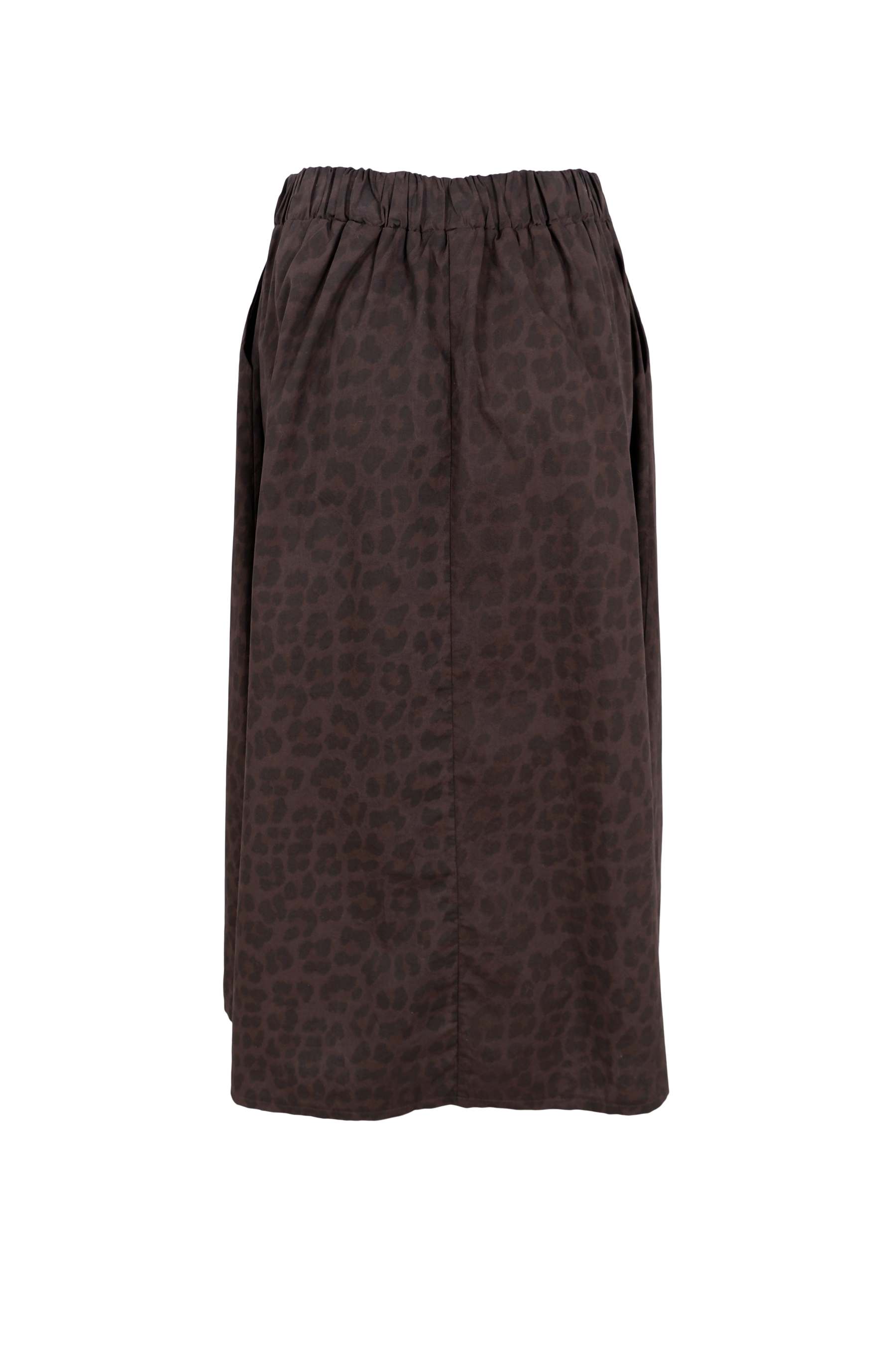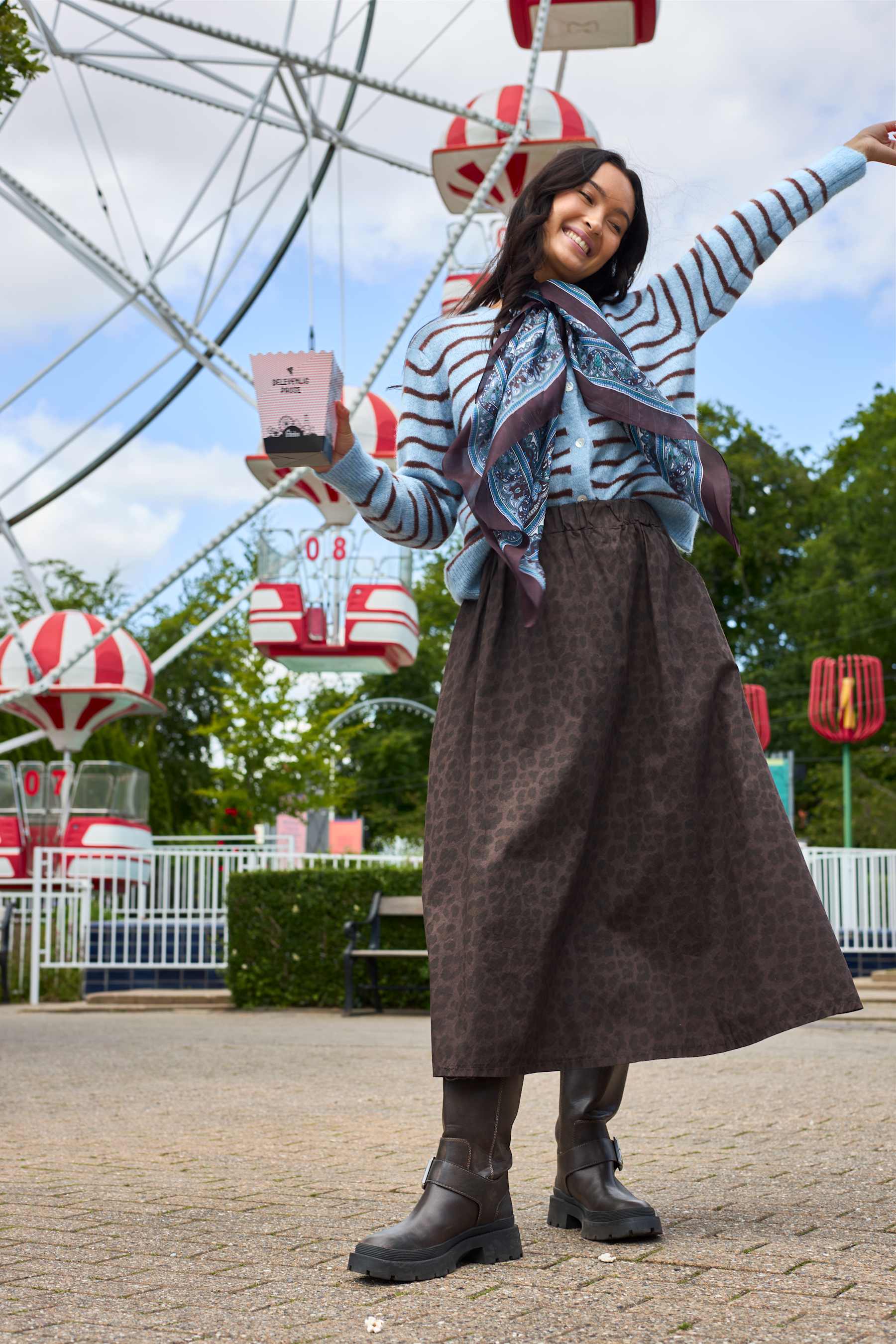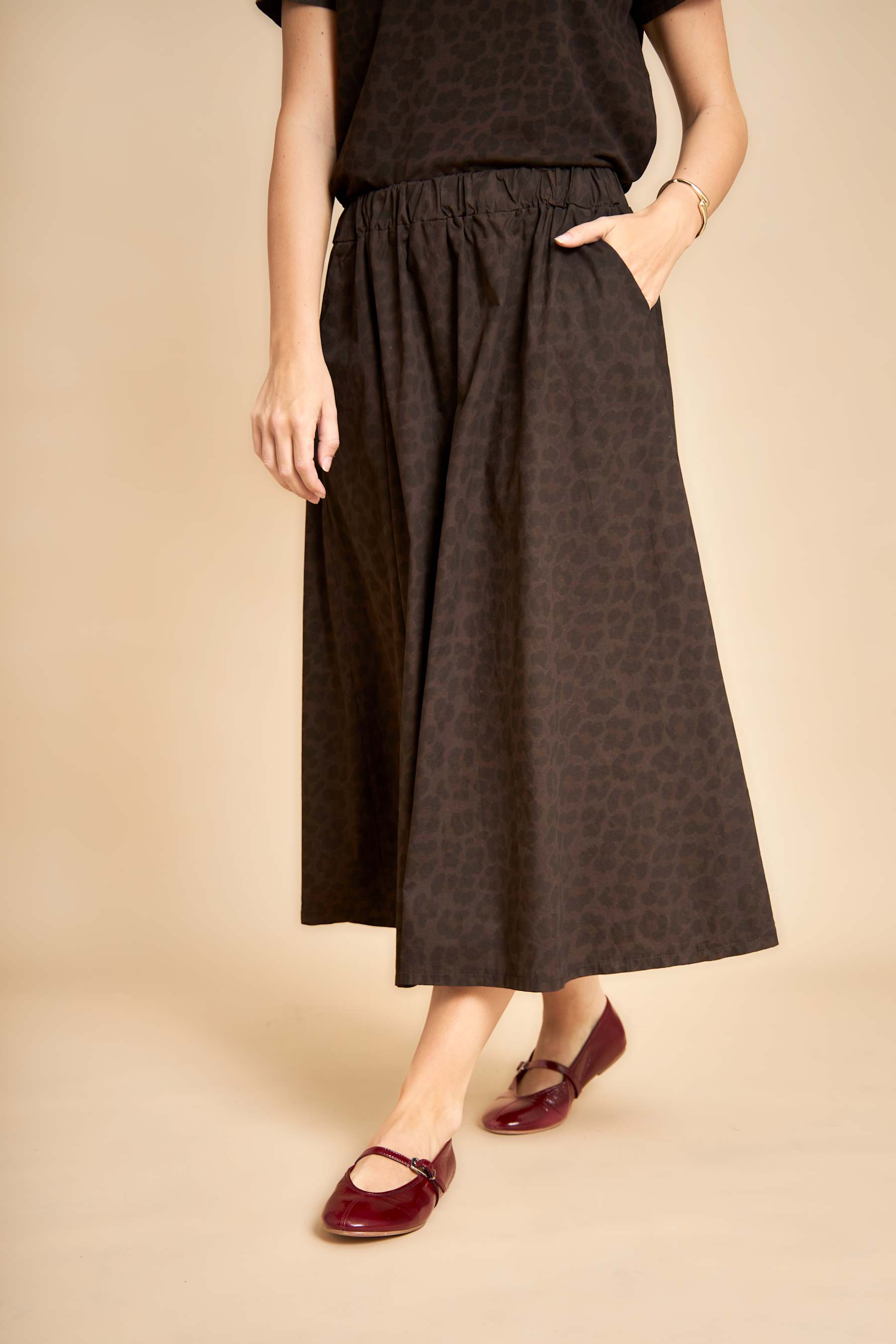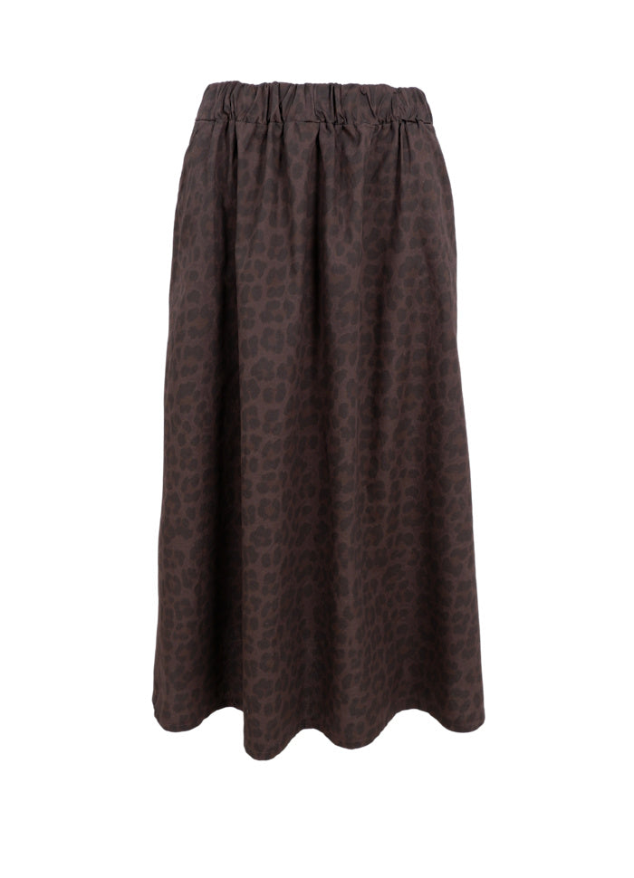 Dejlig og luftig, midilang nederdel fra Black Colour i det smukkeste mørkebrune leoprint. Nederdelen har en løs pasform og A-facon. Den har desuden elastik i taljen og lommer i siderne.