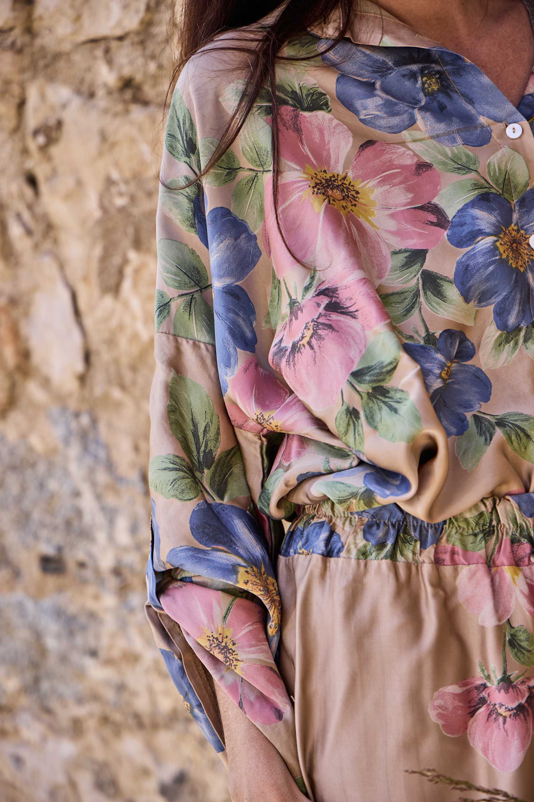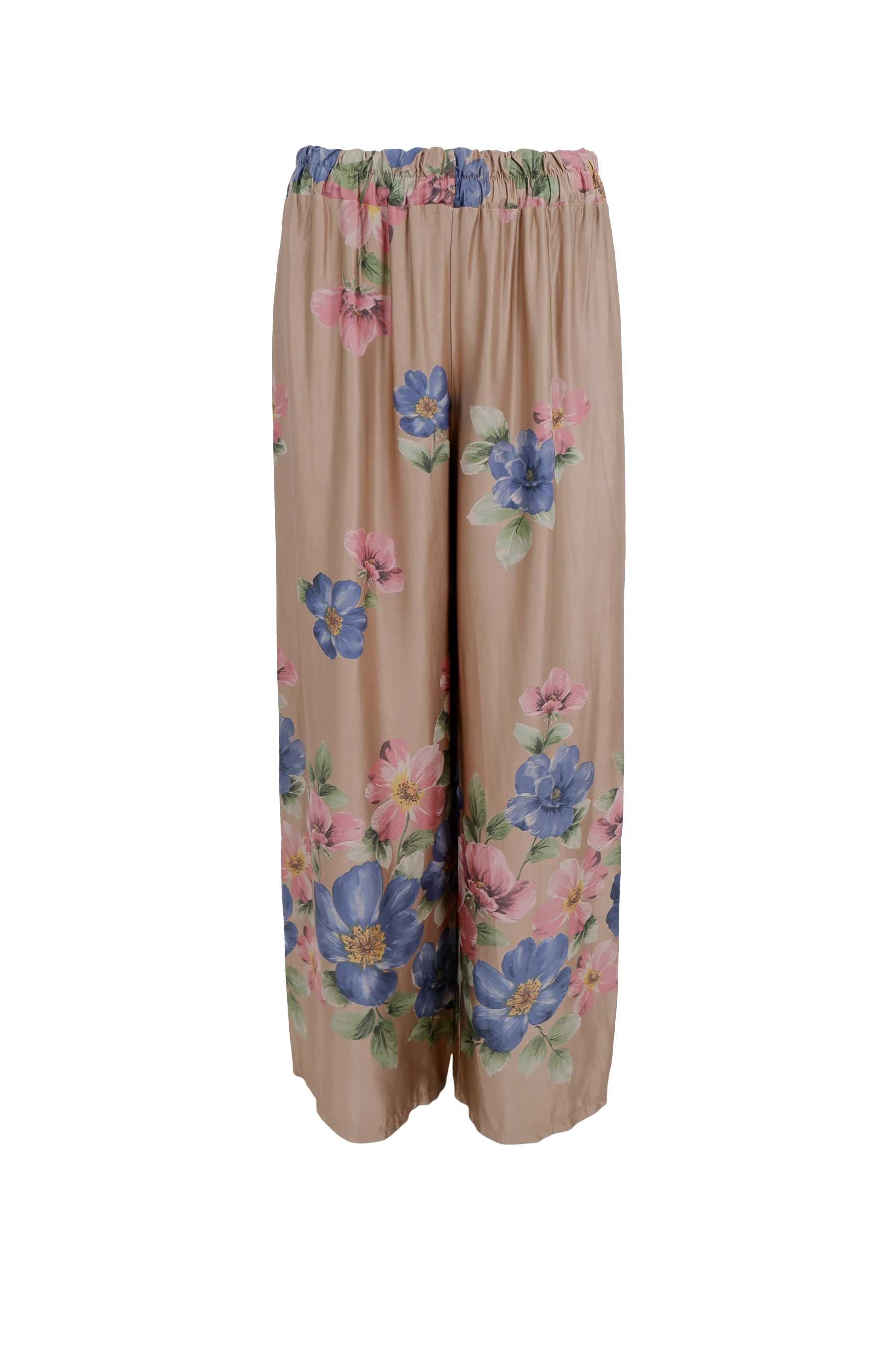 De smukkeste bukser fra Black Colour i det fineste viskose satin med elegant blomsterprint på en lys/gylden bund. Bukserne har elastik i taljen og en løs pasform så de falder smukt.