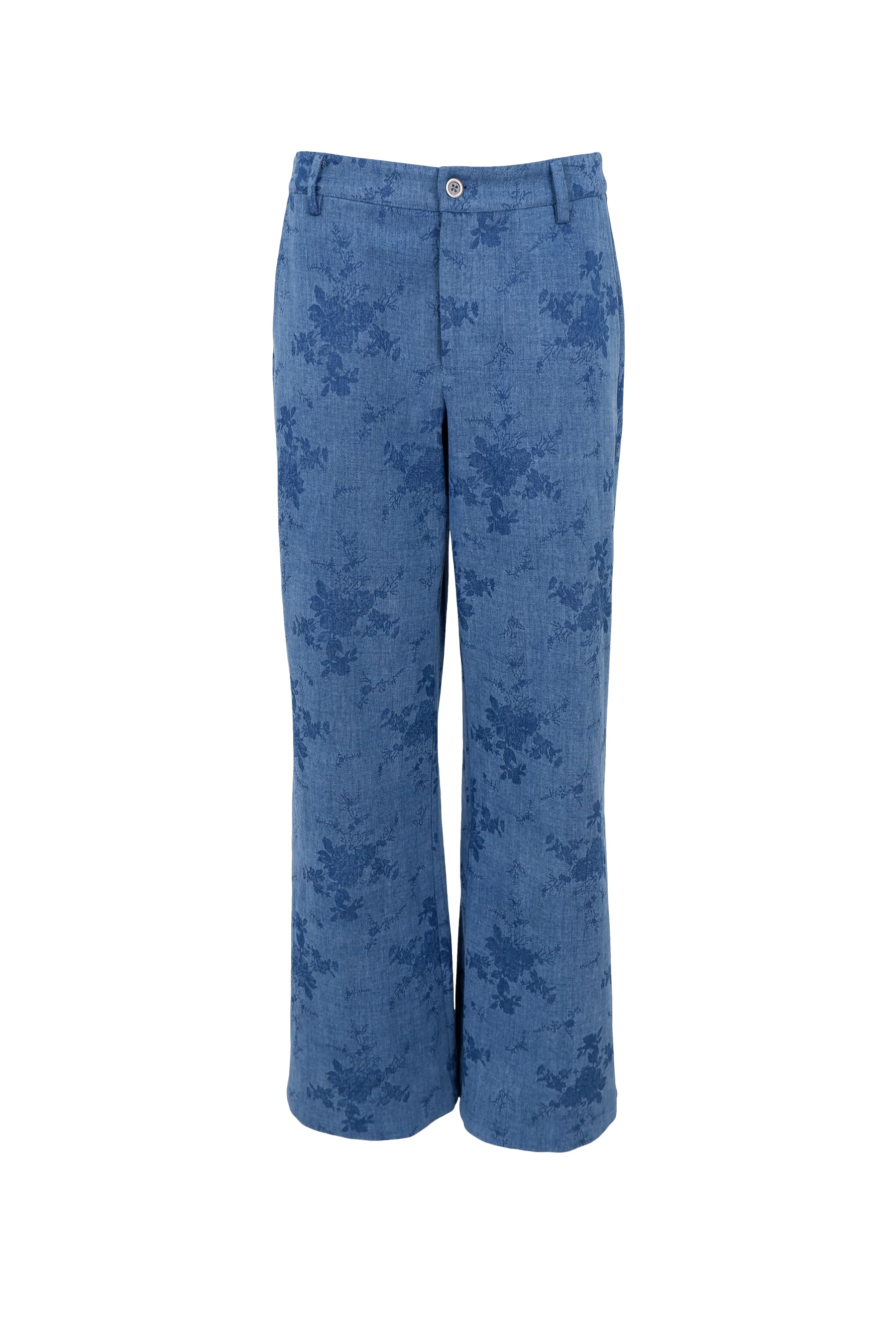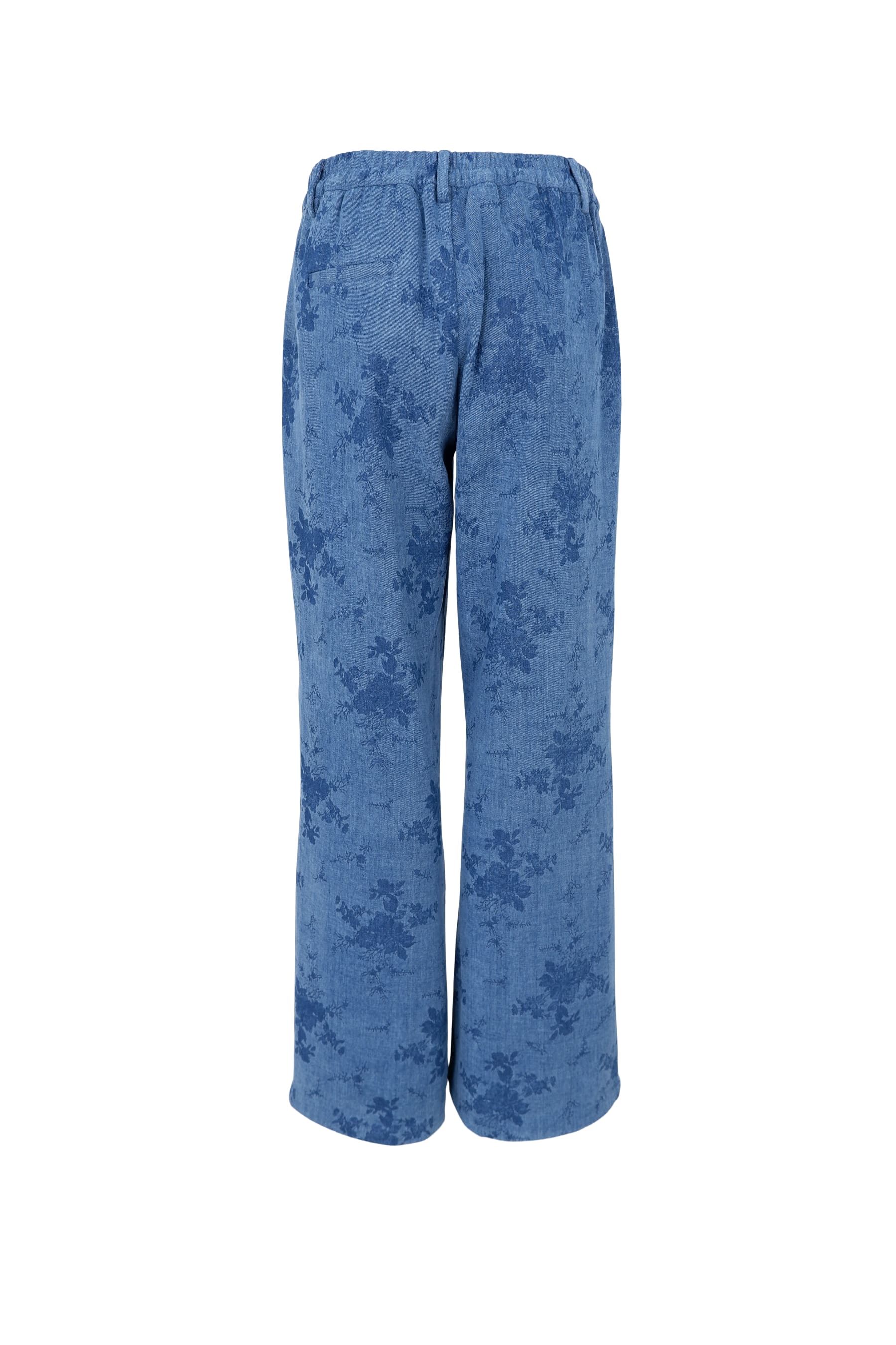 Den skønne box pant i denim med blomster print. Vidde i benene og elastik bagpå i taljen.