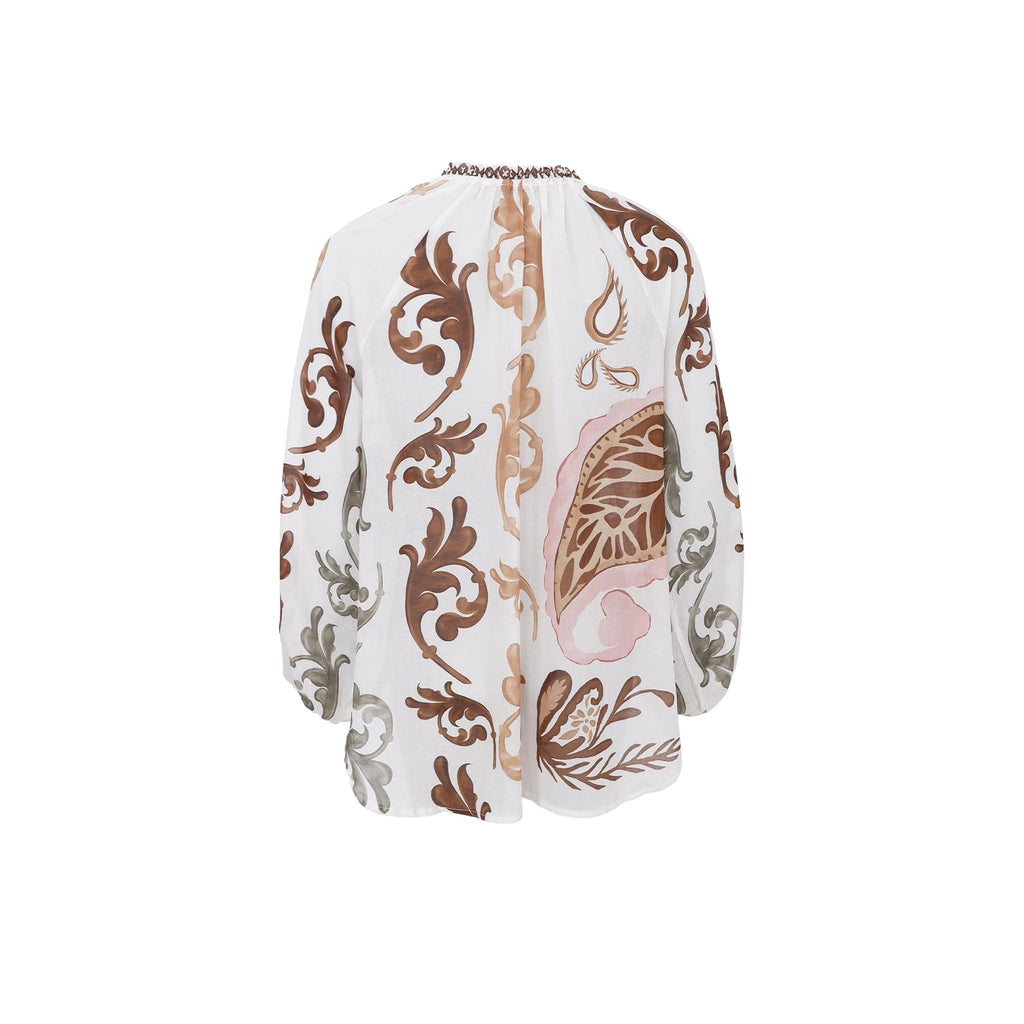 Super smuk bluse fra Black Colour i et roligt blomster print på en off white baggrund. Blusen er i ren bomuld, har en fin v-udskæring, løs pasform og er desuden onesize.