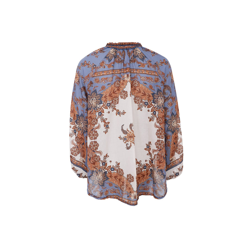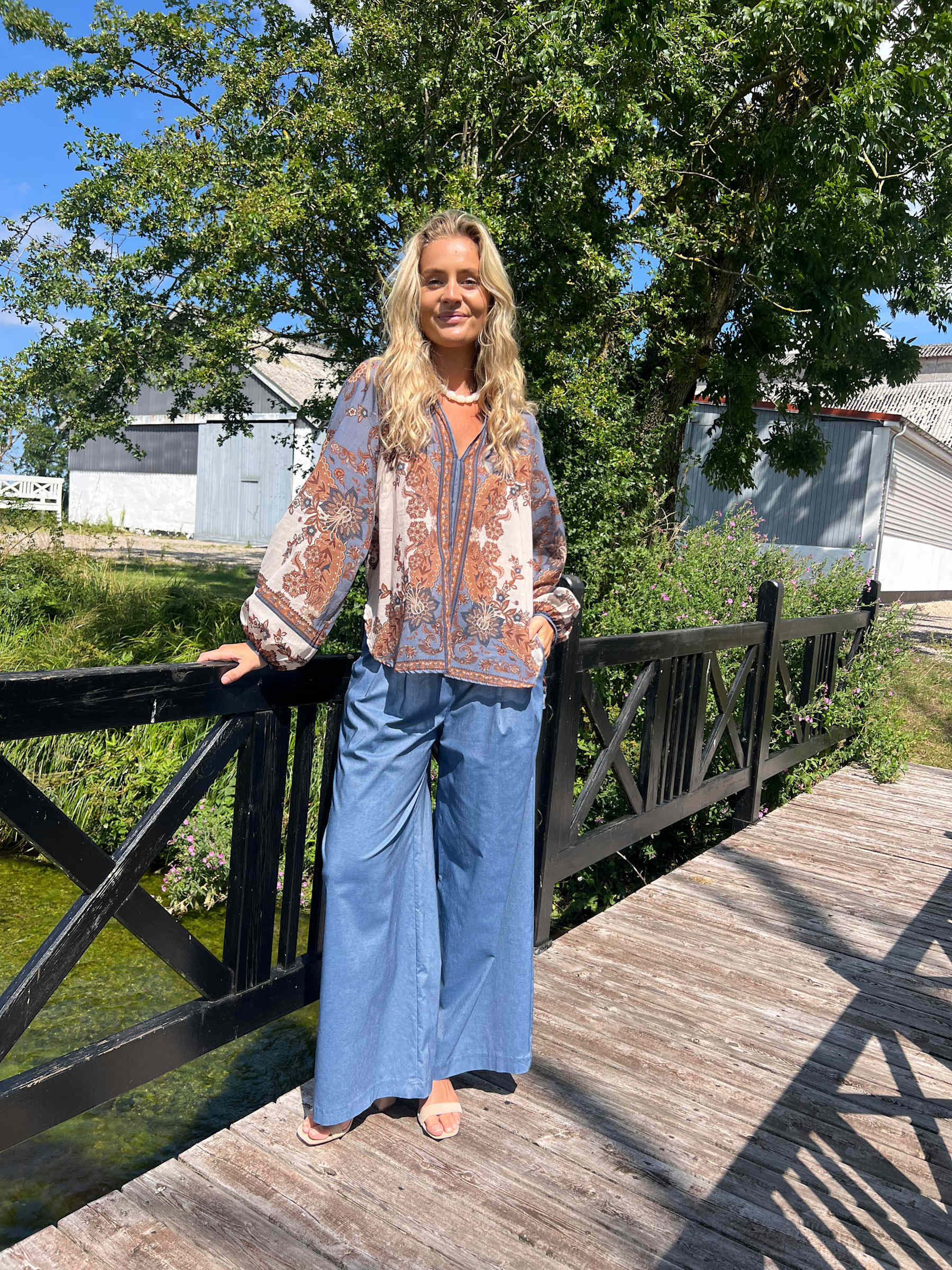 Super smuk bluse fra Black Colour i et smukt print i blå og brunlige nuancer på en off white baggrund. Blusen er i ren bomuld, har en fin v-udskæring, løs pasform og er desuden onesize.