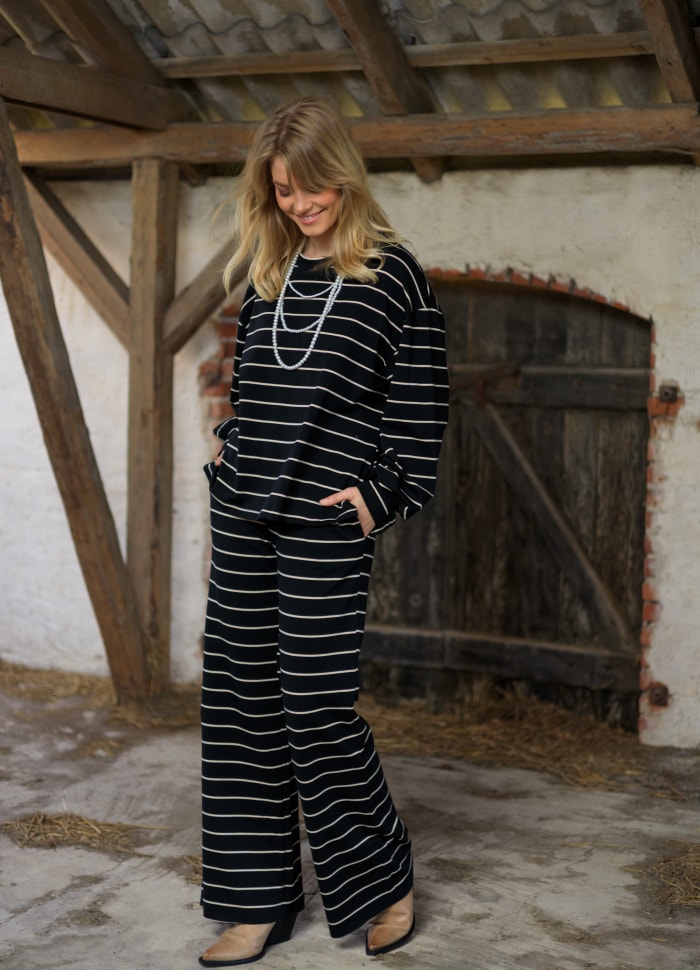 Lækre sweatpants fra Black Colour i sort med vandrette striber. Bukserne har høj talje, skrålommer og vidde i benene. Matchende sweatshirt fåes. BUKSERNE ER MED RET LANGE BEN - DE KLIPPES BLOT AF FORNEDEN, HVIS DE ER FOR LANGE