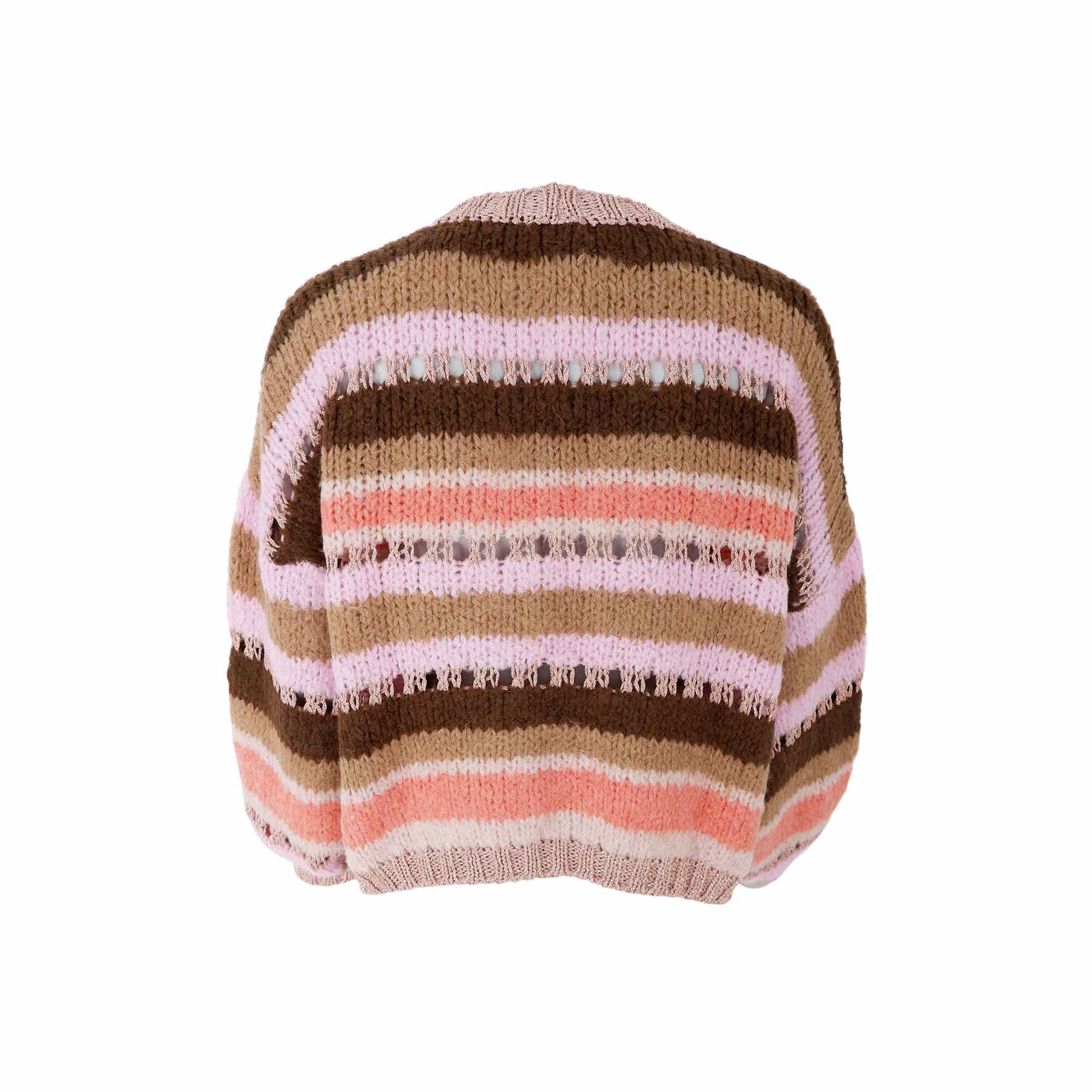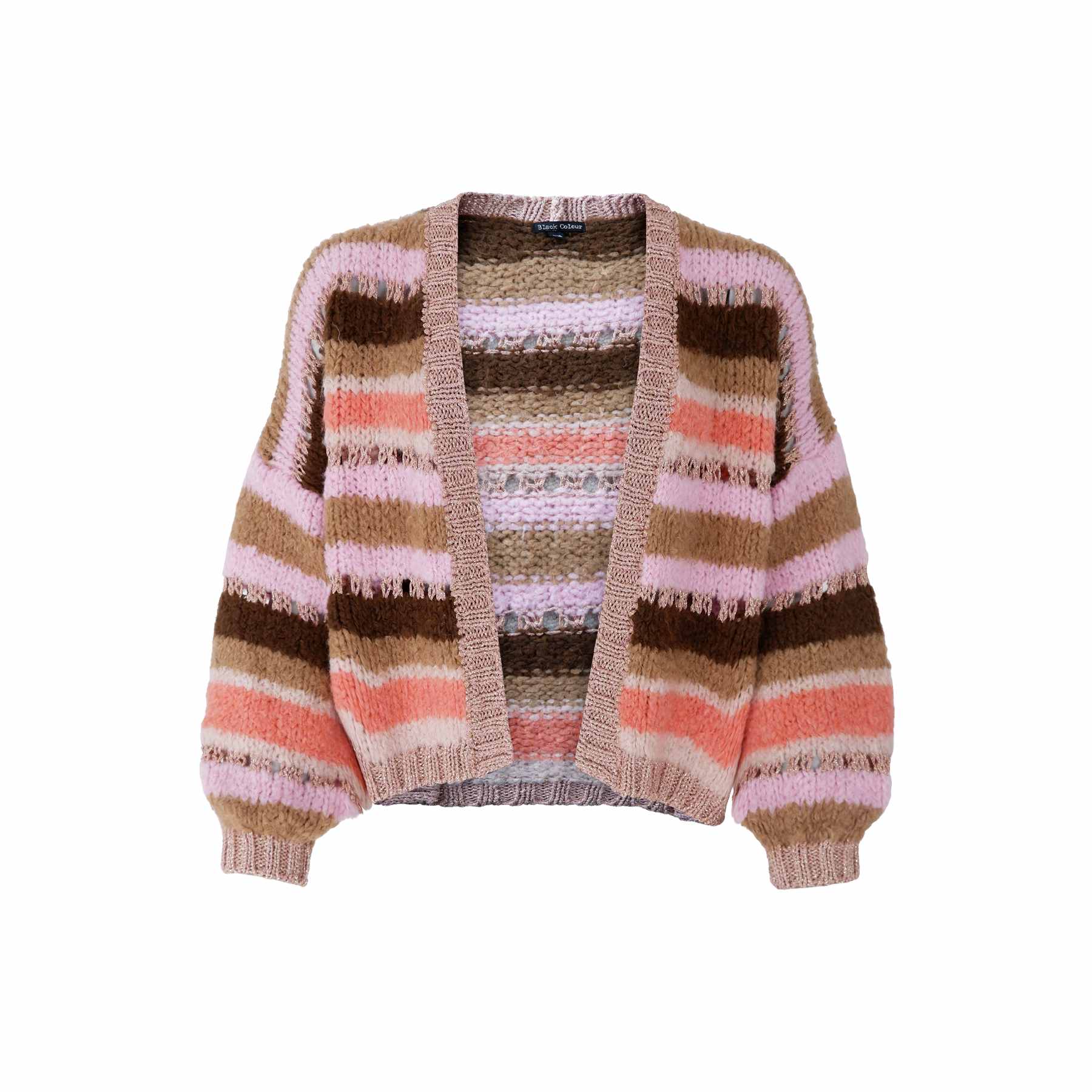 Stribet strikcardigan med åben front og diskrete lurexdetaljer, der giver et let glitrende udtryk. Cardiganen har lange ærmer med indsnævrede manchetter, en løs og afslappet pasform samt bløde ribkanter langs front og afslutninger. Farverne er holdt i harmoniske nuancer af rosa, beige, brun og støvet koral, som giver et varmt og feminint look.