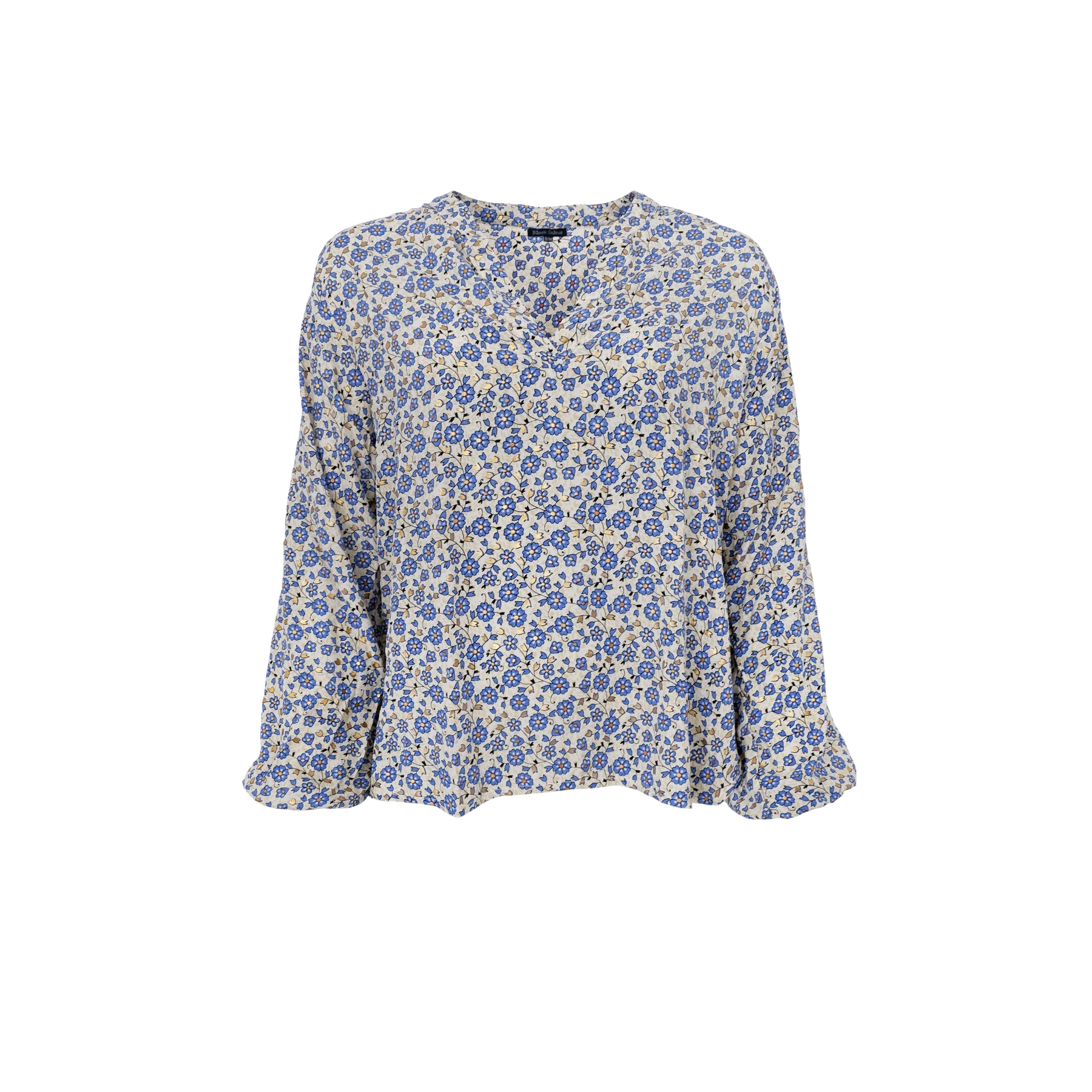Fin bluse fra Black Colour i sort med et skønt print. Blusen har lange ærmer og kina krave med V-hals. Den har elastik kant ved håndleddet. Blusen er loose i fittet.