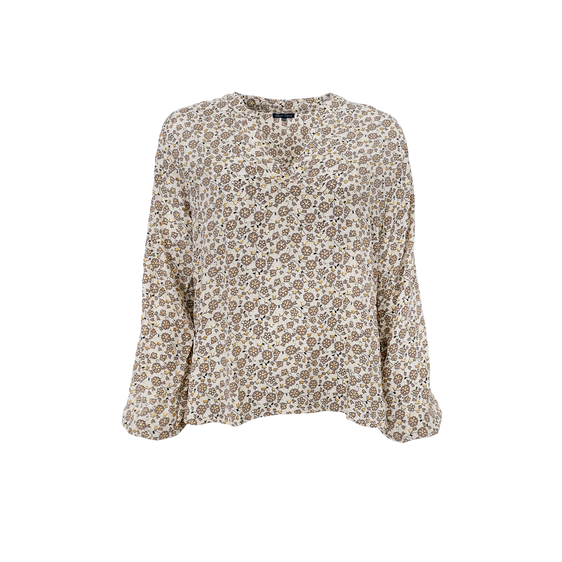 Fin bluse fra Black Colour i sort med et skønt print. Blusen har lange ærmer og kina krave med V-hals. Den har elastik kant ved håndleddet. Blusen er loose i fittet.