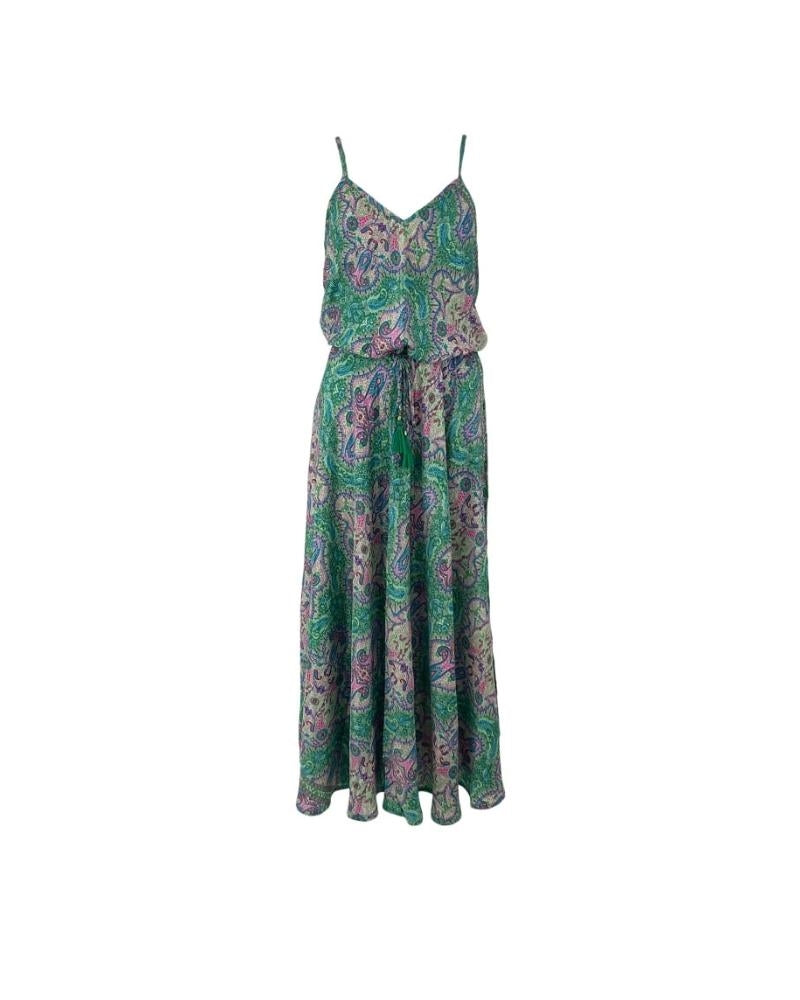 Lovely maxi length summer strapdress in mixed prints with string at waist.