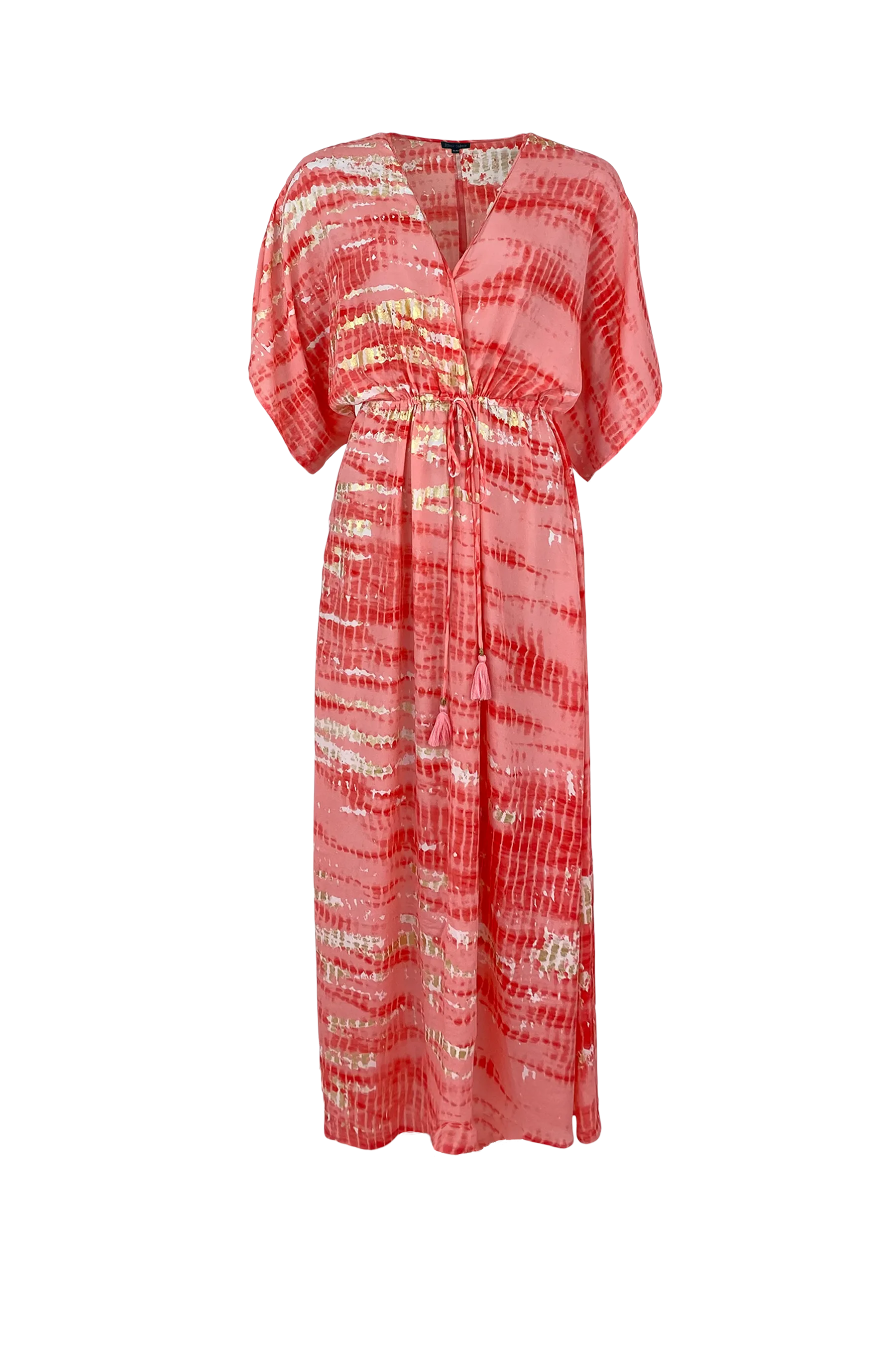 Den velkendte kjole fra Black Colour med v-udskæring, bånd under brystet og maxi længde. Kjolen har kort ærme og slidser i begge sider. Print i coral, rosa, hvid og guld.