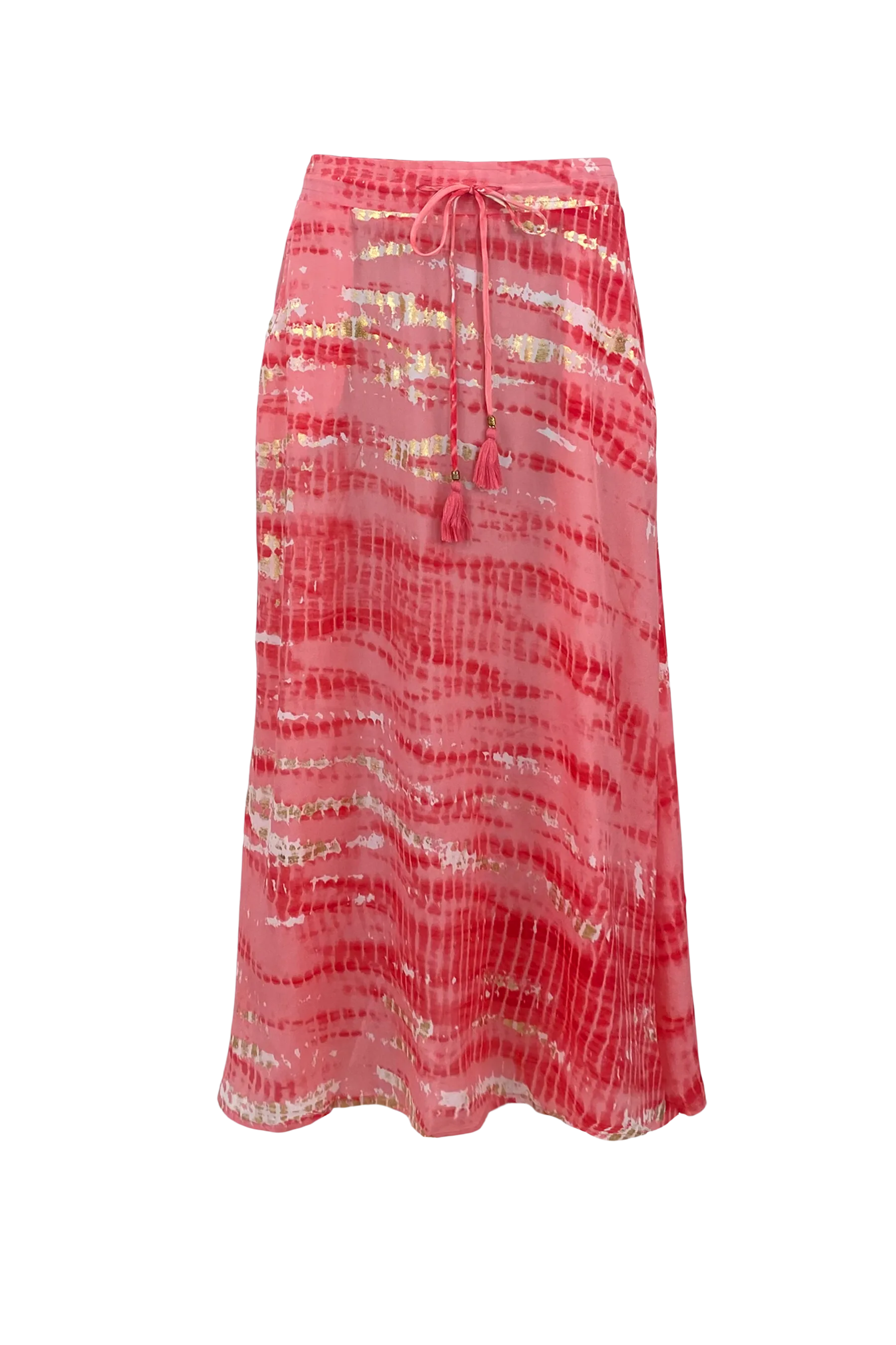 7/8 længde nederdele i strygefrit material. med lommer, fast linning foran og elastik bagpå. Print i coral, rosa, hvid og guld