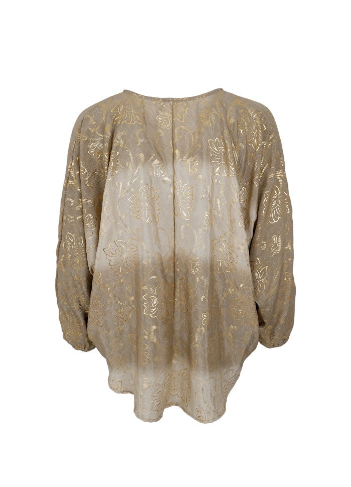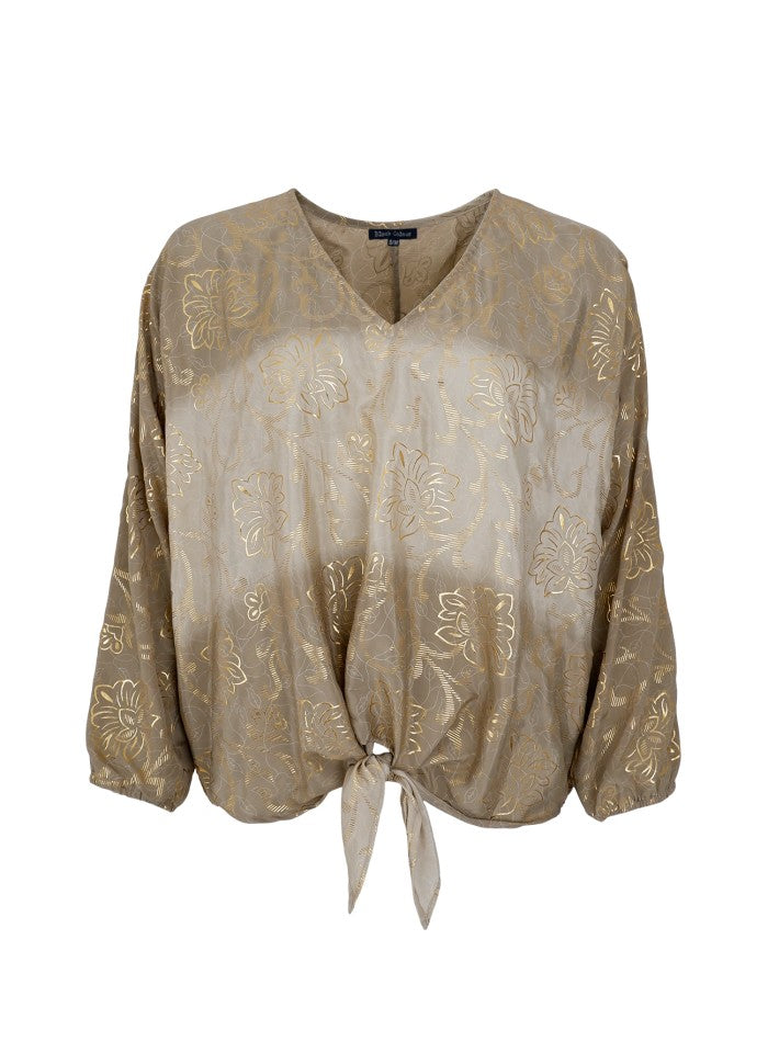 Skøn bluse fra Black Colour i et flot guldmønster. Blusen har v-udskæring, elastik ved ærmerne og kan bindes fortil. Pasformen er oversize.